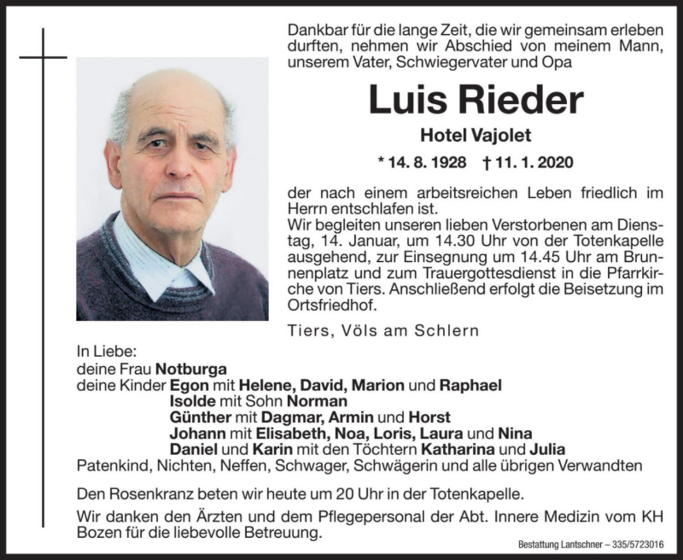 Wir begleiten unseren lieben Verstorbenen am Dienstag, 14. Januar um 14.30 Uhr