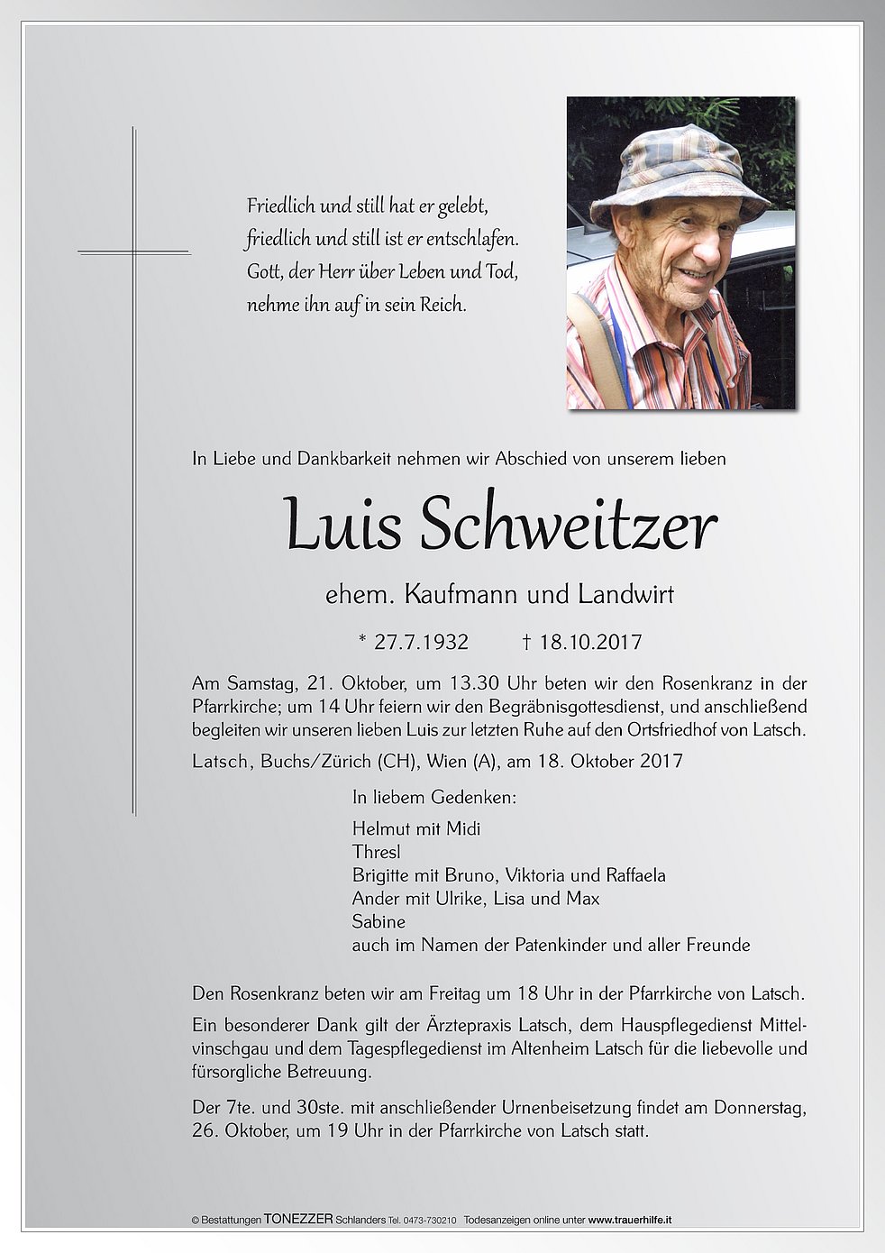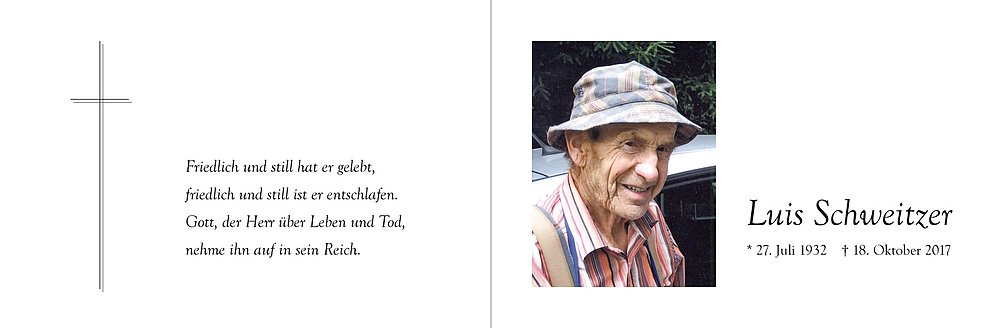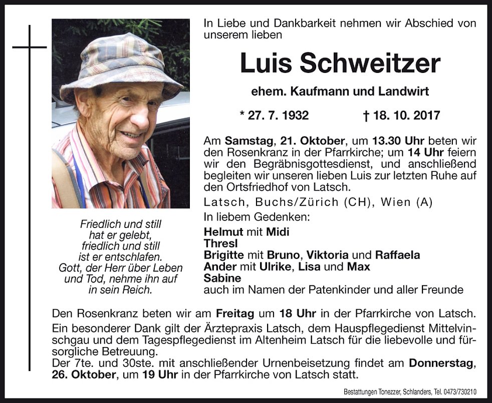 Am Samstag, 21. Oktober, um 13.30 Uhr beten wir den Rosenkranz in der Pfarrkirche; um 14 Uhr feiern wir den Begräbnisgottesdienst, und anschließend begleiten wir unseren lieben Luis zur letzten Ruhe auf den Ortsfriedhof von Latsch.