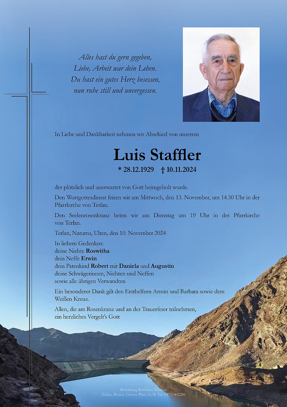 Den Wortgottesdienst feiern wir am Mittwoch, den 13. November, um 14.30 Uhr in der Pfarrkirche von Terlan.