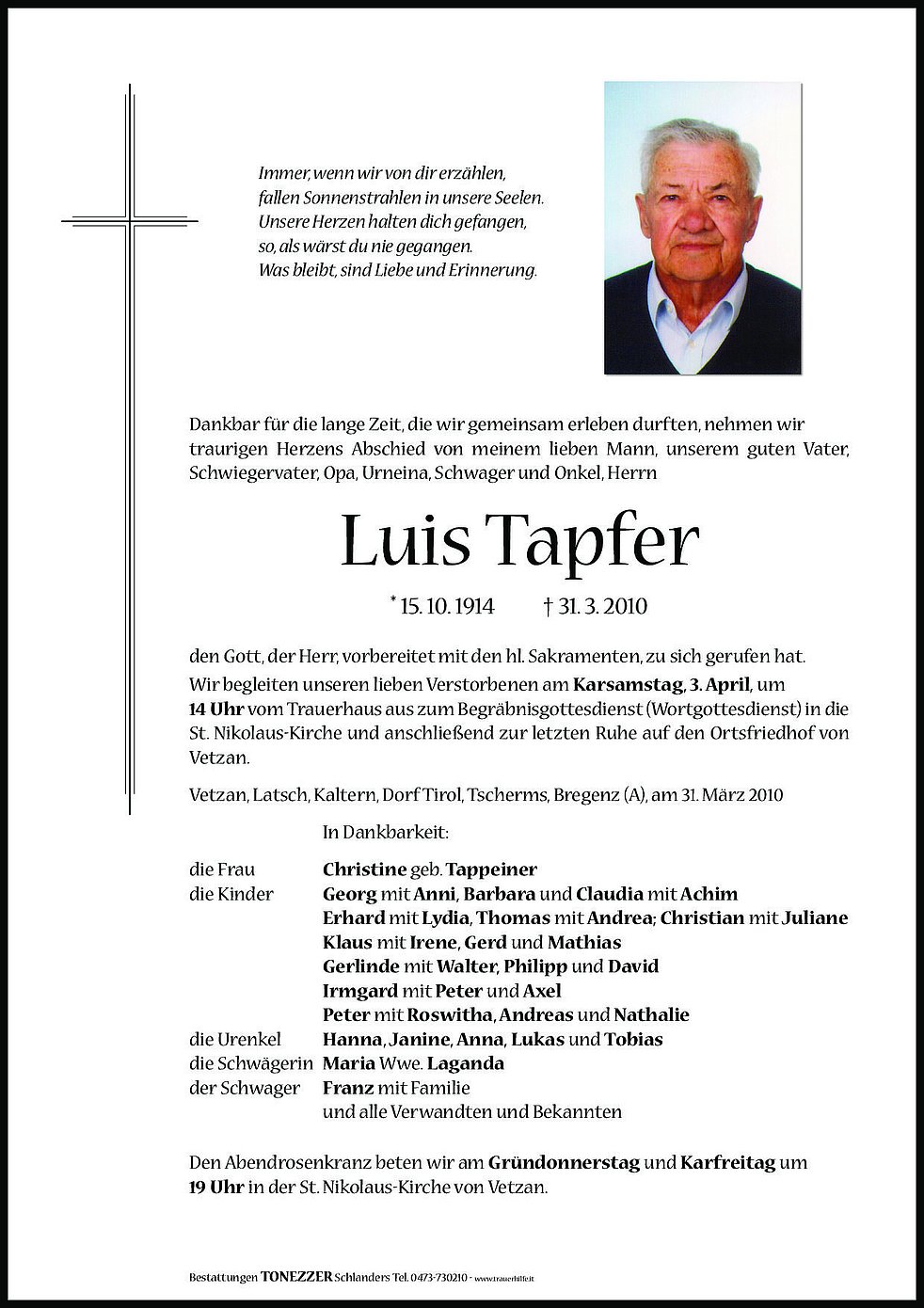14 Uhr vom Trauerhaus aus zum Begräbnisgottesdienst (Wortgottesdienst) in die St.-Nikolaus-Kirche und anschließend zur letzten Ruhe auf den Ortsfriedhof von Vetzan.