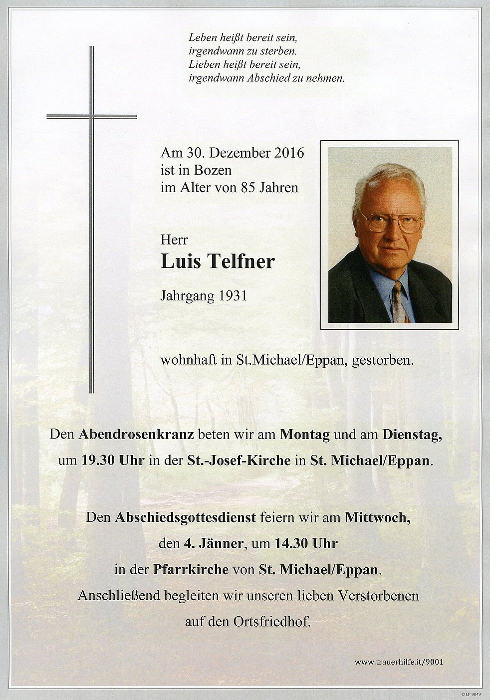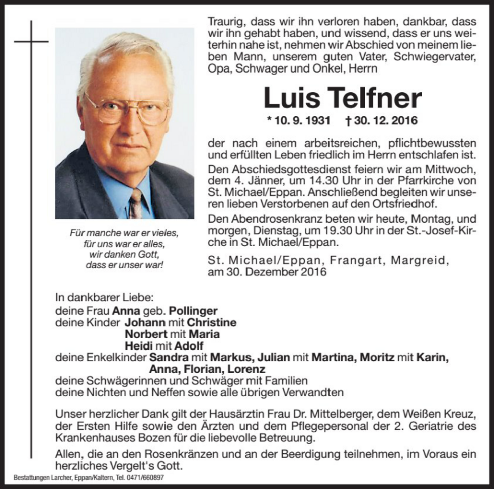 Den Abschiedsgottesdienst feiern wir am Mittwoch, dem 4. Jänner um 14.30 Uhr in der Pfarrkirche von St. Michael/Eppan. Anschließend begleiten wir unseren lieben Verstorbenen auf den Ortsfriedhof.