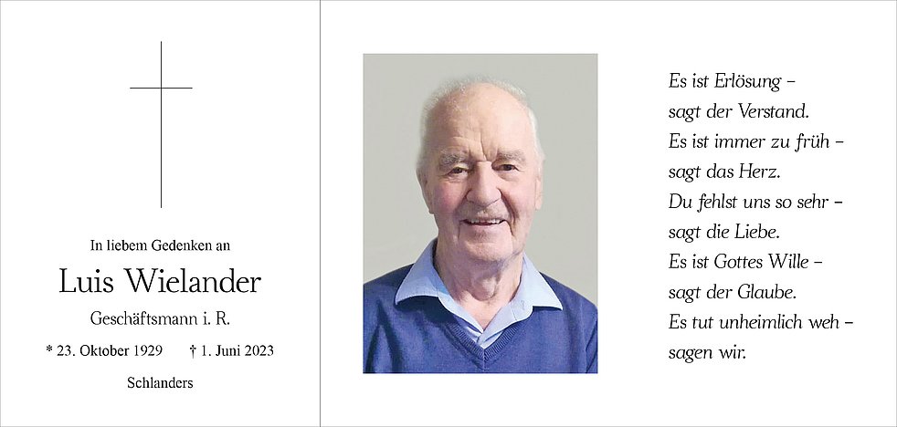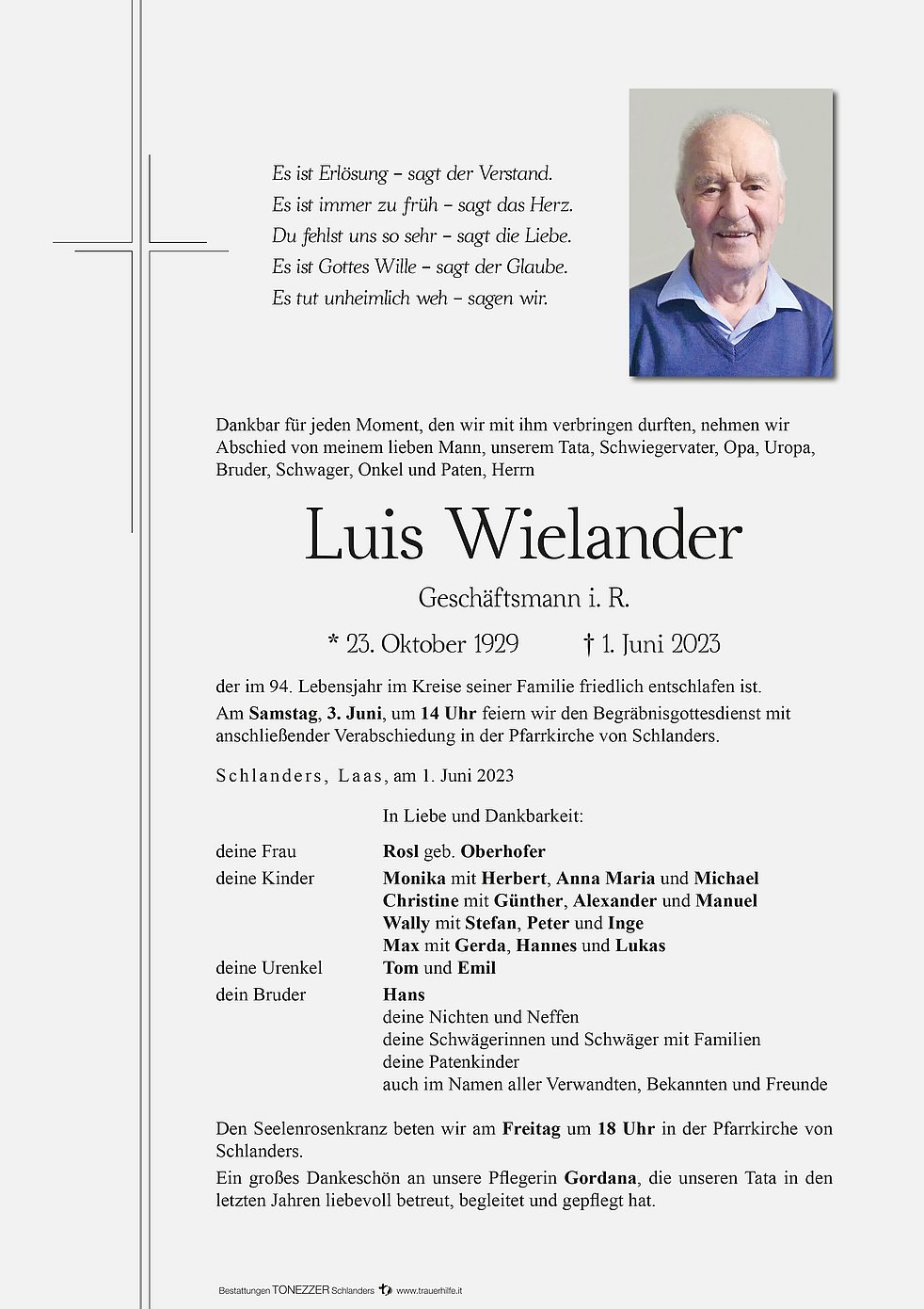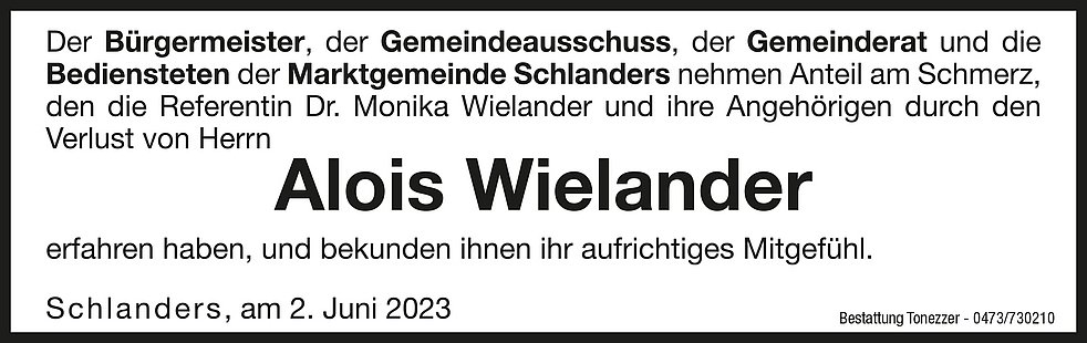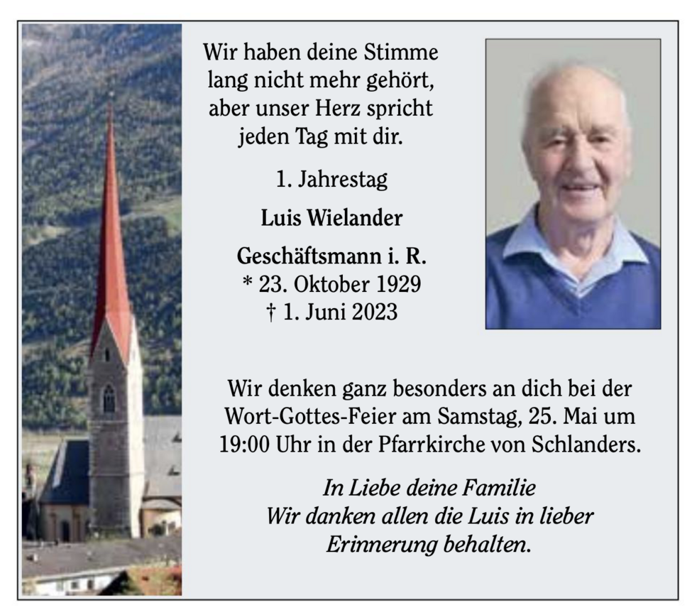 Am Samstag, 3. Juni, um 14 Uhr feiern wir den Begräbnisgottesdienst mit anschließender Verabschiedung in der Pfarrkirche von Schlanders.