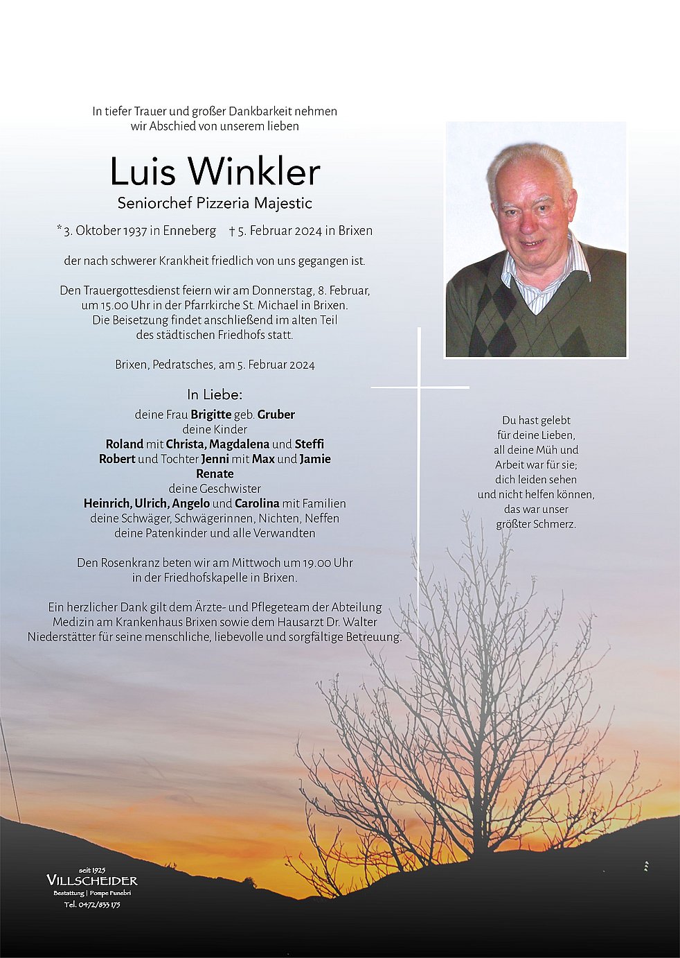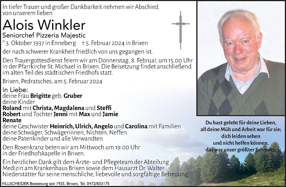 Trauerfeier: 08.02. - 15:00 Uhr Brixen