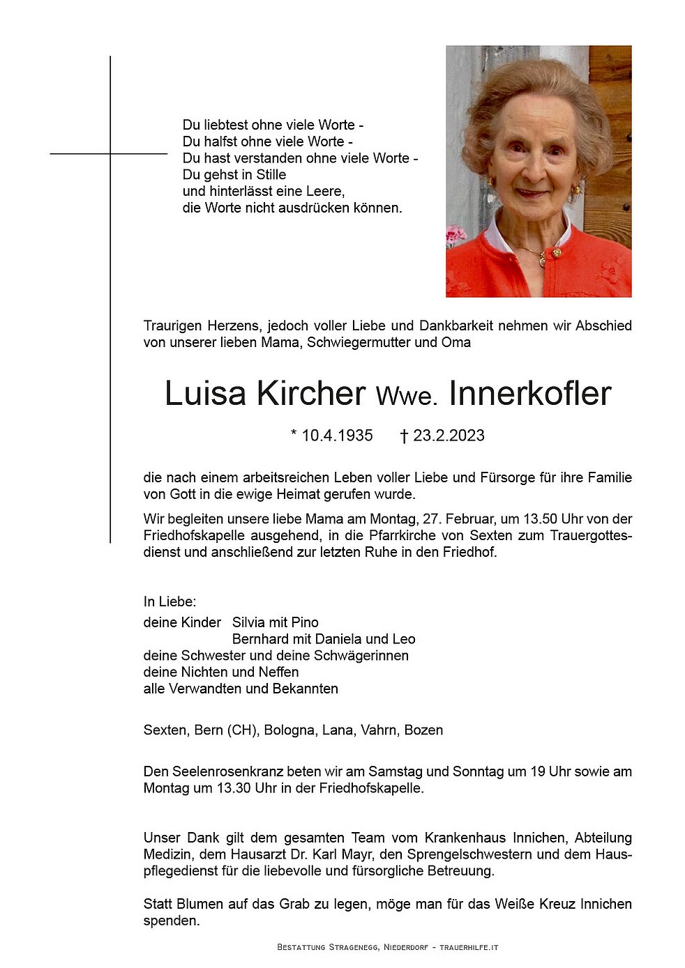 In Anteilnahme gedenken wir der lieben verstorbenen Mutter und Oma und bekunden hiermit unser inniges Beileid allen Familienangehörigen.