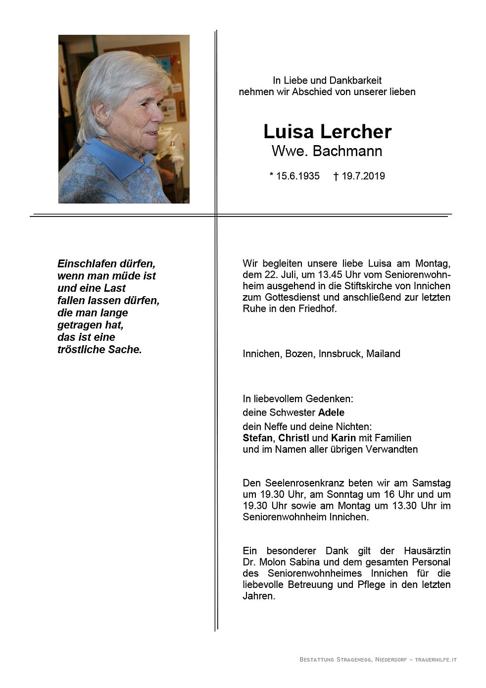 Wir begleiten unsere liebe Luisa am Montag, dem 22. Juli, um 13.45 Uhr vom Seniorenwohnheim ausgehend in die Stiftskirche von Innichen zum Gottesdienst und anschließend zur letzten Ruhe in den Friedhof.