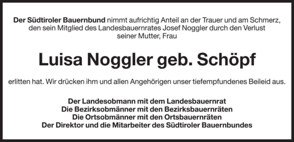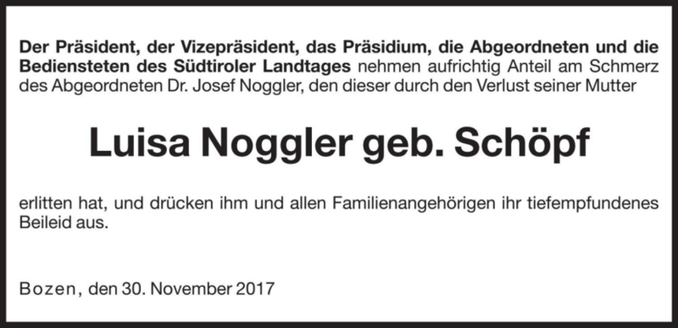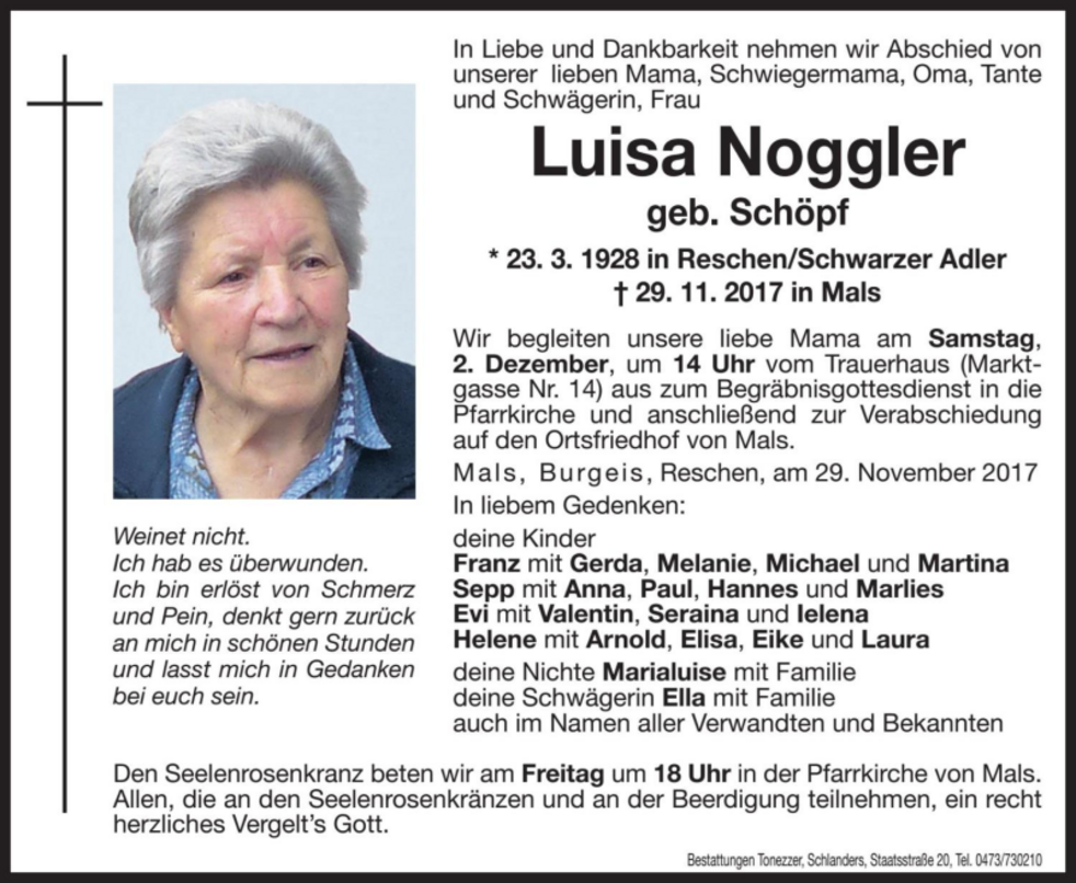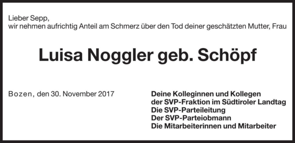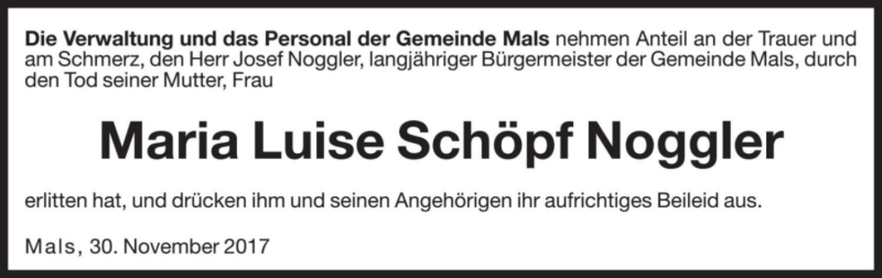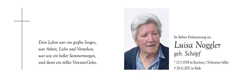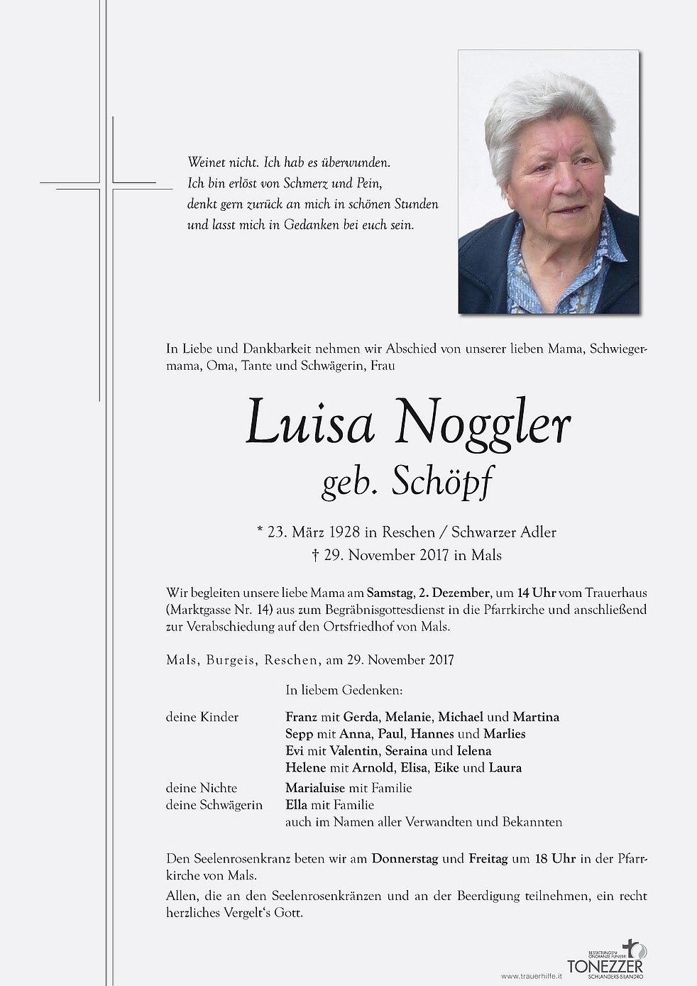 Wir begleiten unsere liebe Mama am Samstag, 2. Dezember, um 14 Uhr vom Trauerhaus (Marktgasse Nr. 14) aus zum Begräbnisgottesdienst in die Pfarrkirche und anschließend zur Verabschiedung auf den Ortsfriedhof von Mals.