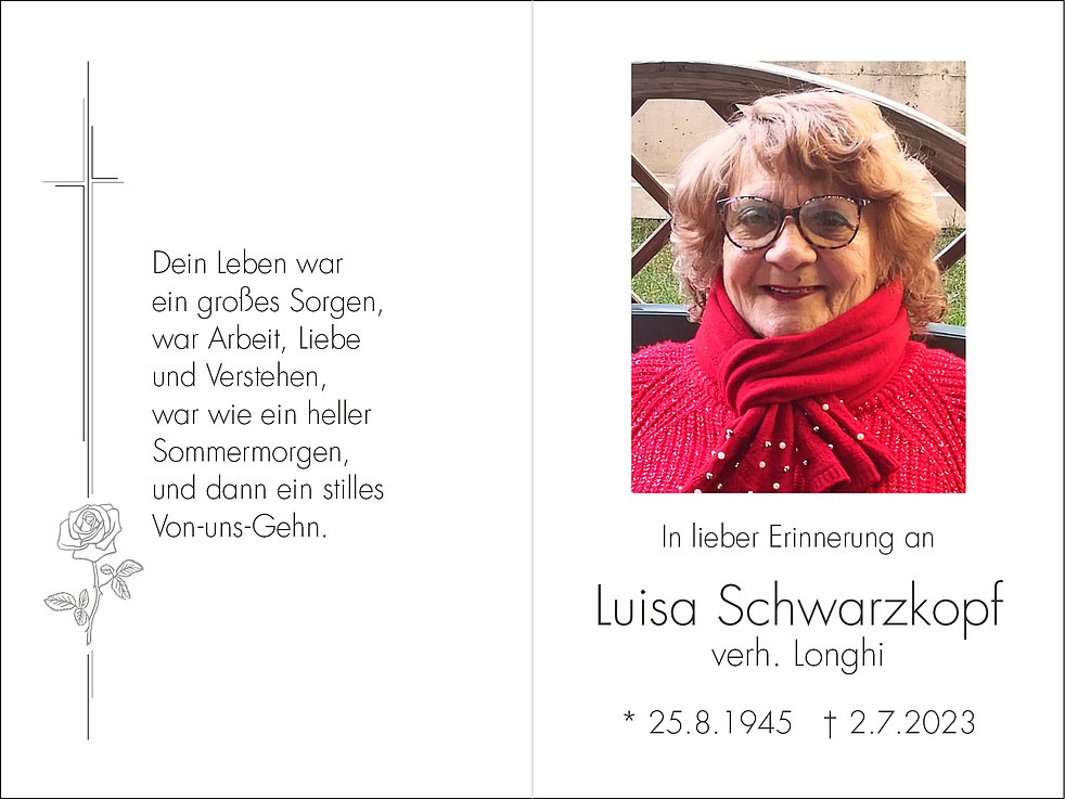 Traurig, aber dankbar für die schöne Zeit, die wir gemeinsam verbringen durften, nehmen wir Abschied von meiner lieben Frau, unserer Mama, Schwiegermutter, Oma, Uroma, Schwester, Schwägerin, Tante und Patin, Frau