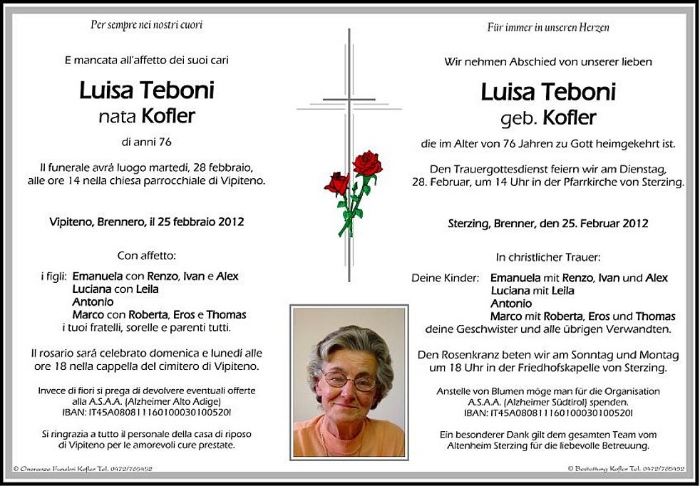 Invece di fiori si prega di devolvere eventuali offerte alla A.S.A.A. (Alzheimer Alto Adige)