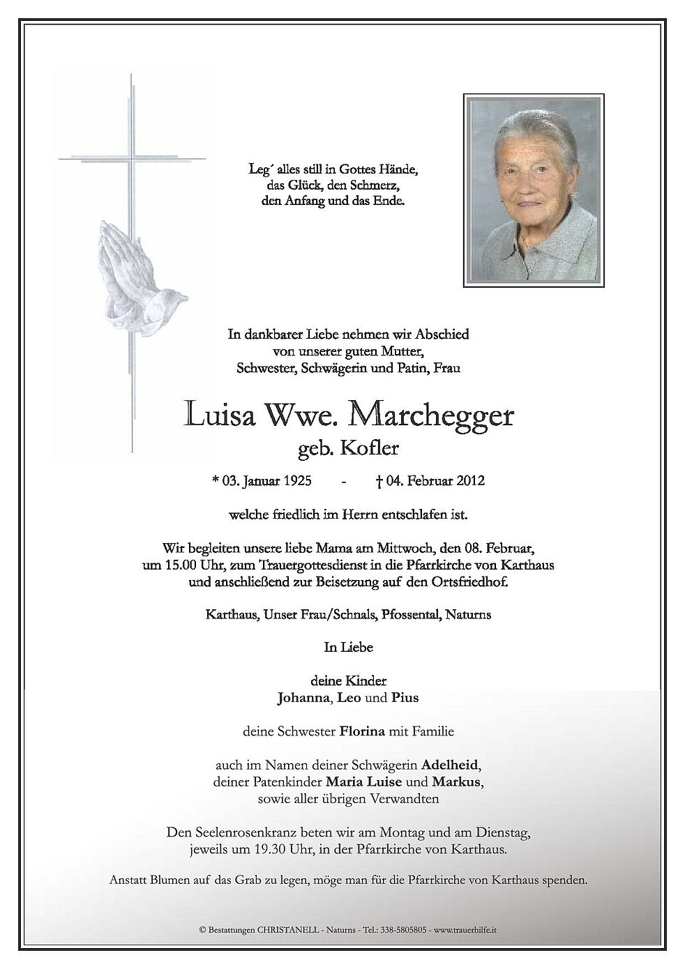 Wir begleiten unsere liebe Mama am Mittwoch, den 08. Februar, um 15.00 Uhr, zum Trauergottesdienst in die Pfarrkirche von Karthaus und anschließend zur Beisetzung auf den Ortsfriedhof.