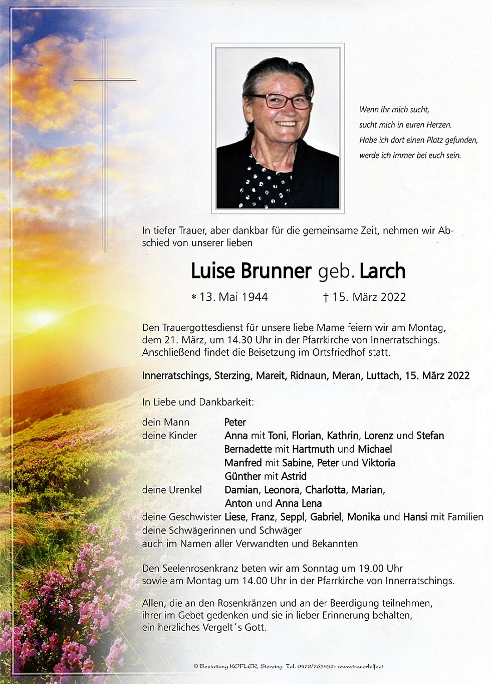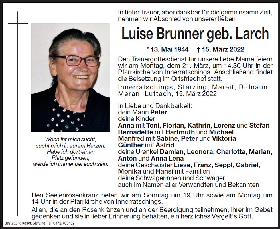 Den Trauergottesdienst für unsere liebe Mame feiern wir am Montag, dem 21. März, um 14.30 Uhr in der Pfarrkirche von Innerratschings. Anschließend findet die Beisetzung im Ortsfriedhof statt.