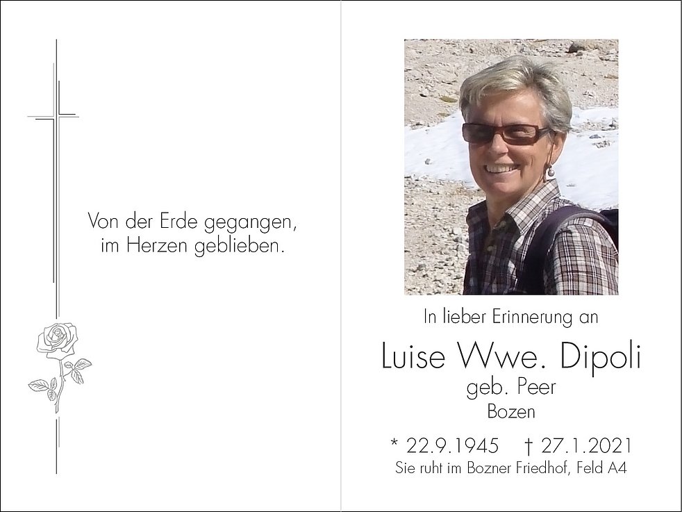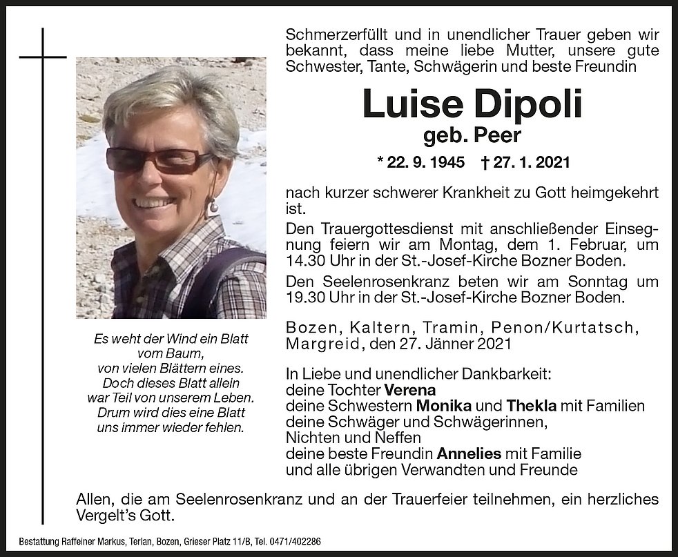Den Trauergottesdienst mit anschließender Einsegnung feiern wir am Montag, dem 1. Februar, um 14.30 Uhr in der St.-Josef-Kirche Bozner Boden.