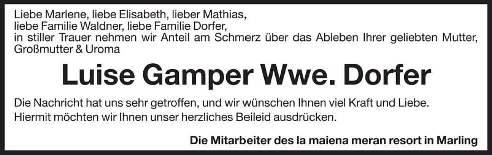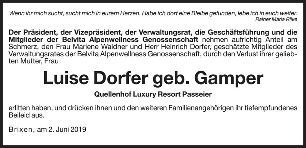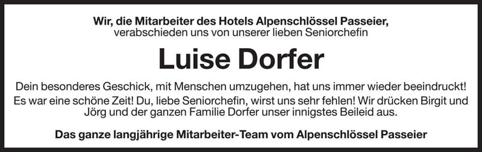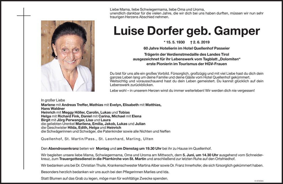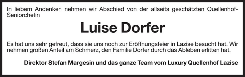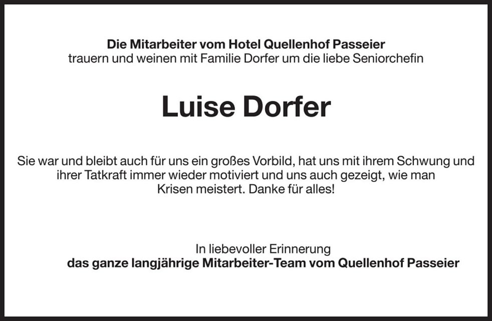 Du bist für uns alle ein großes Vorbild. Fürsorglich, großzügig und mit viel Liebe hast du dich dein ganzes Leben lang um deine Familie und deine Gäste vom Hotel Quellenhof gekümmert. Weitsichtig und vorausschauend hast du dein Leben gemeistert. Du kannst glücklich auf dein Lebenswerk zurückblicken.
