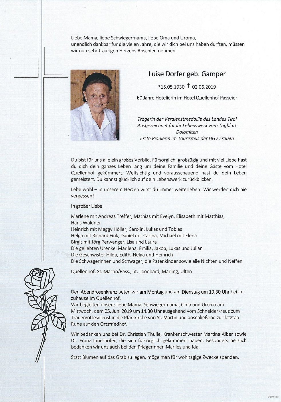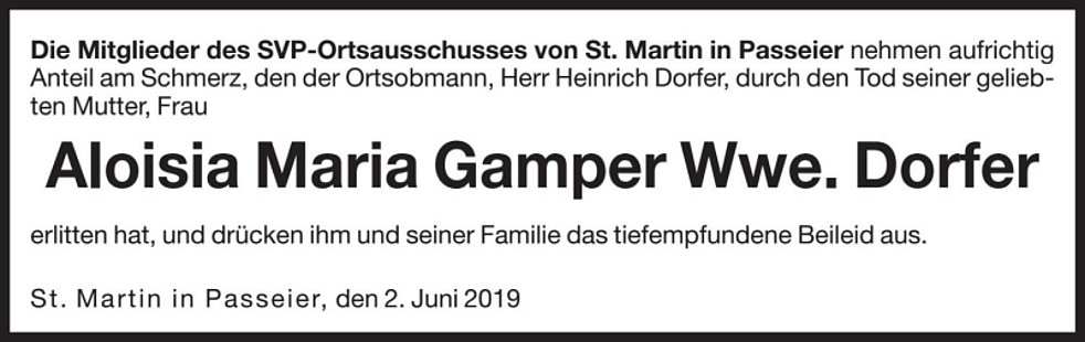 Wir begleiten unsere liebe Mama, Schwiegermama, Oma und Uroma am Mittwoch, dem 05. Juni 2019 um 14.30 Uhr ausgehend vom Schneiderkreuz zum Trauergottesdienst in die Pfarrkirche von St. Martin und anschließend zur letzten Ruhe auf den Ortsfriedhof.