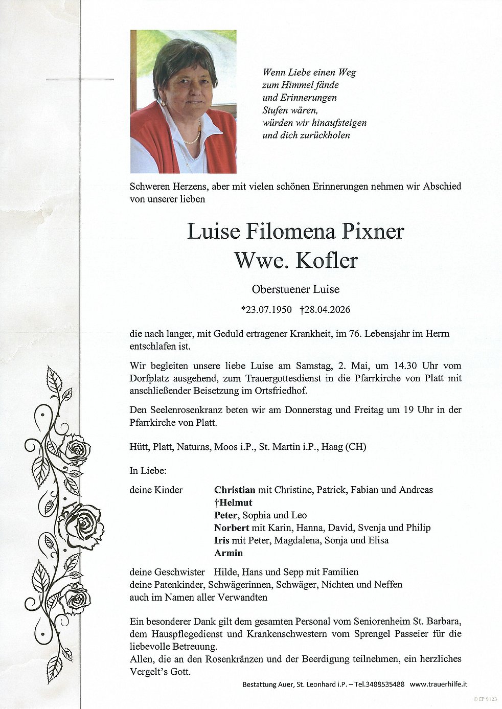 Wir begleiten unsere liebe Luise am Samstag, 2. Mai, um 14.30 Uhr vom Dorfplatz ausgehend, zum Trauergottesdienst in die Pfarrkirche von Platt mit anschließender Beisetzung im Ortsfriedhof.