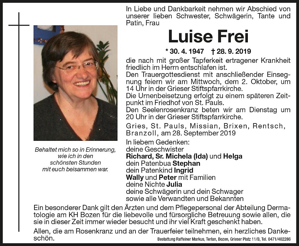 Den Trauergottesdienst mit anschlieβender Einsegnung feiern wir am Mittwoch, dem 2. Oktober, um 14 Uhr in der Grieser Stiftspfarrkirche.