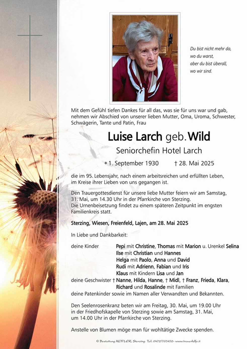 Den Trauergottesdienst für unsere liebe Mutter feiern wir am Samstag, 31. Mai, um 14.30 Uhr in der Pfarrkirche von Sterzing. Die Urnenbeisetzung findet zu einem späteren Zeitpunkt im engsten Familienkreis statt.