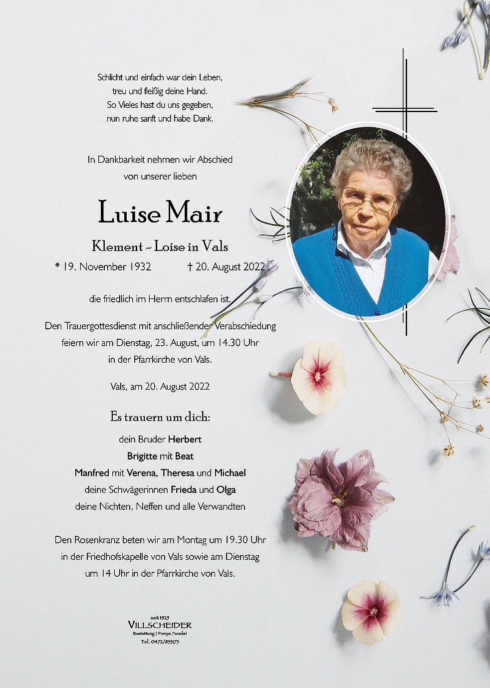 Trauerfeier: 23.08. - 14:30 Uhr Vals