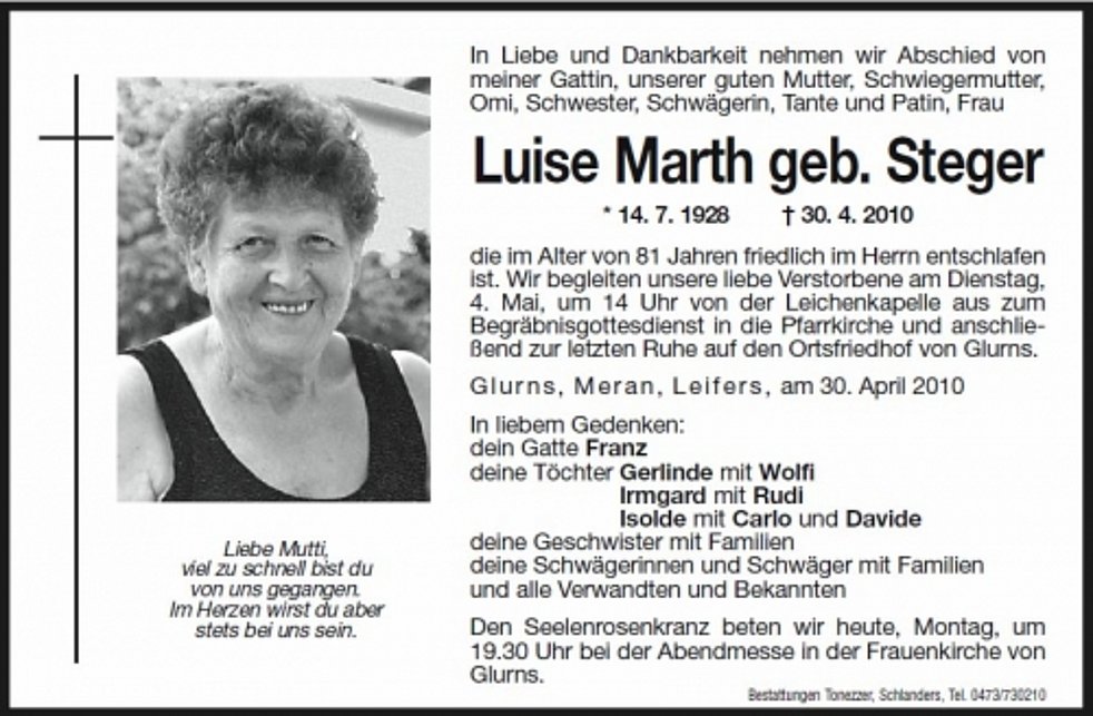 Wir begleiten unsere liebe Verstorbene am Dienstag, 4. Mai, um 14 Uhr von der Leichenkapelle aus zum Begräbnisgottesdienst in die Pfarrkirche und anschließend zur letzten Ruhe auf den Ortsfriedhof von Glurns.