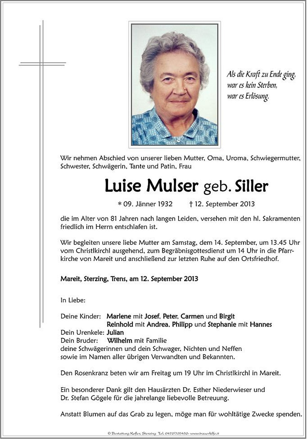 Wir begleiten unsere liebe Mutter am Samstag, dem 14. September, um 13.45 Uhr