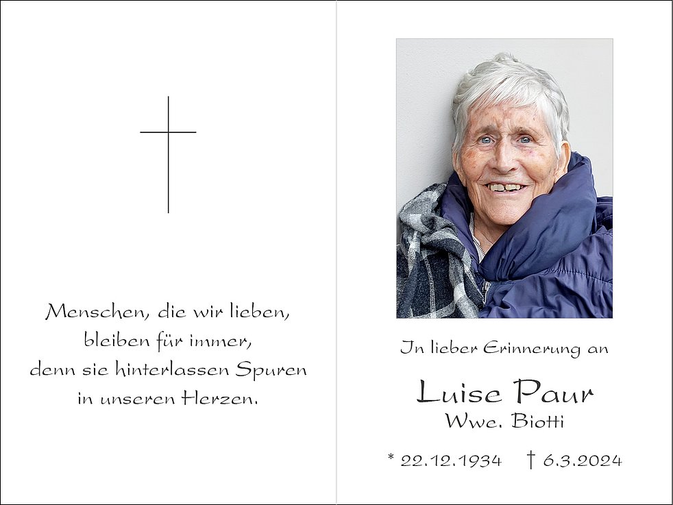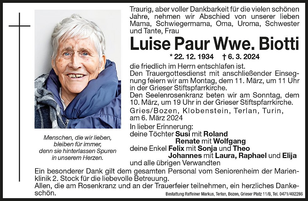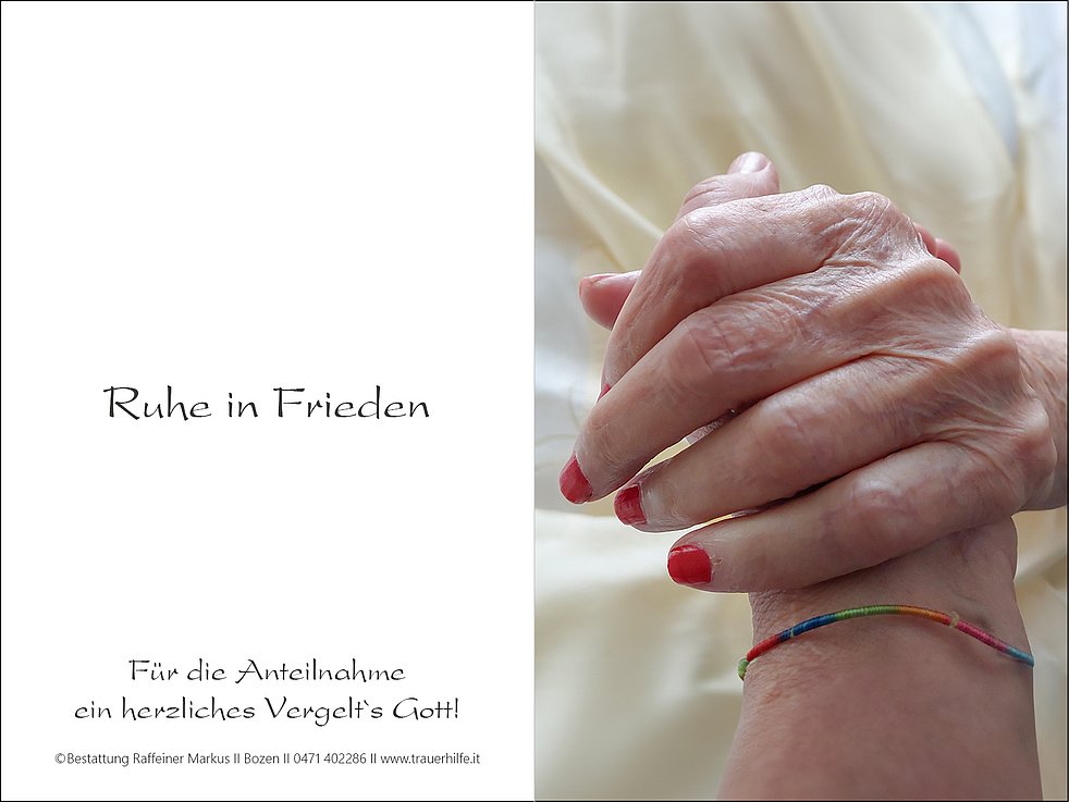 Traurig, aber voller Dankbarkeit für die vielen schönen Jahre nehmen wir Abschied von unserer lieben Mama, Schwiegermama, Oma, Uroma, Schwester und Tante, Frau
