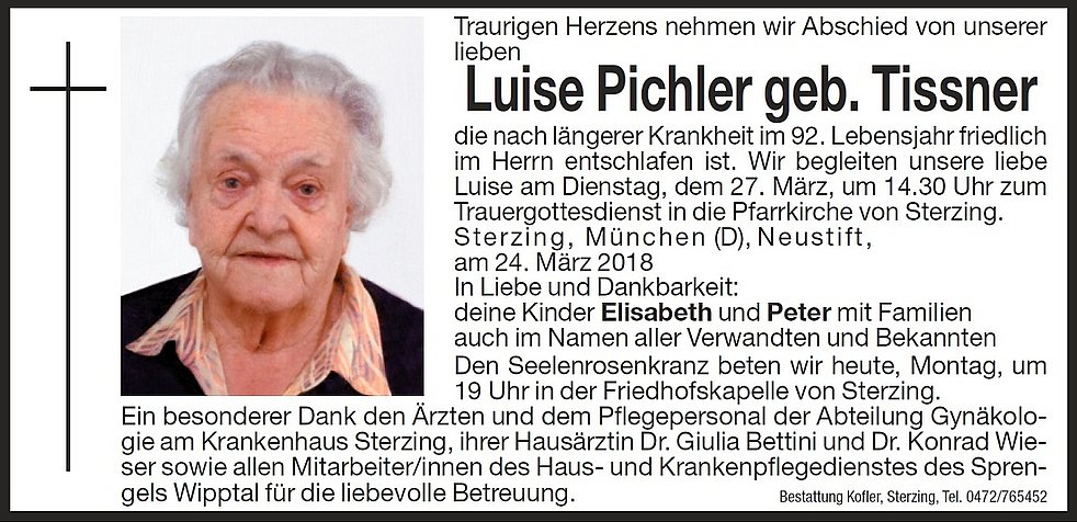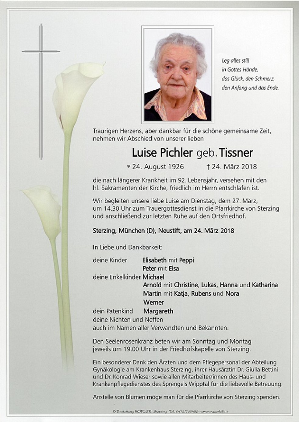 Wir begleiten unsere liebe Luise am Dienstag, dem 27. März, um 14.30 Uhr zum Trauergottesdienst in die Pfarrkirche von Sterzing und anschließend zur letzten Ruhe auf den Ortsfriedhof.