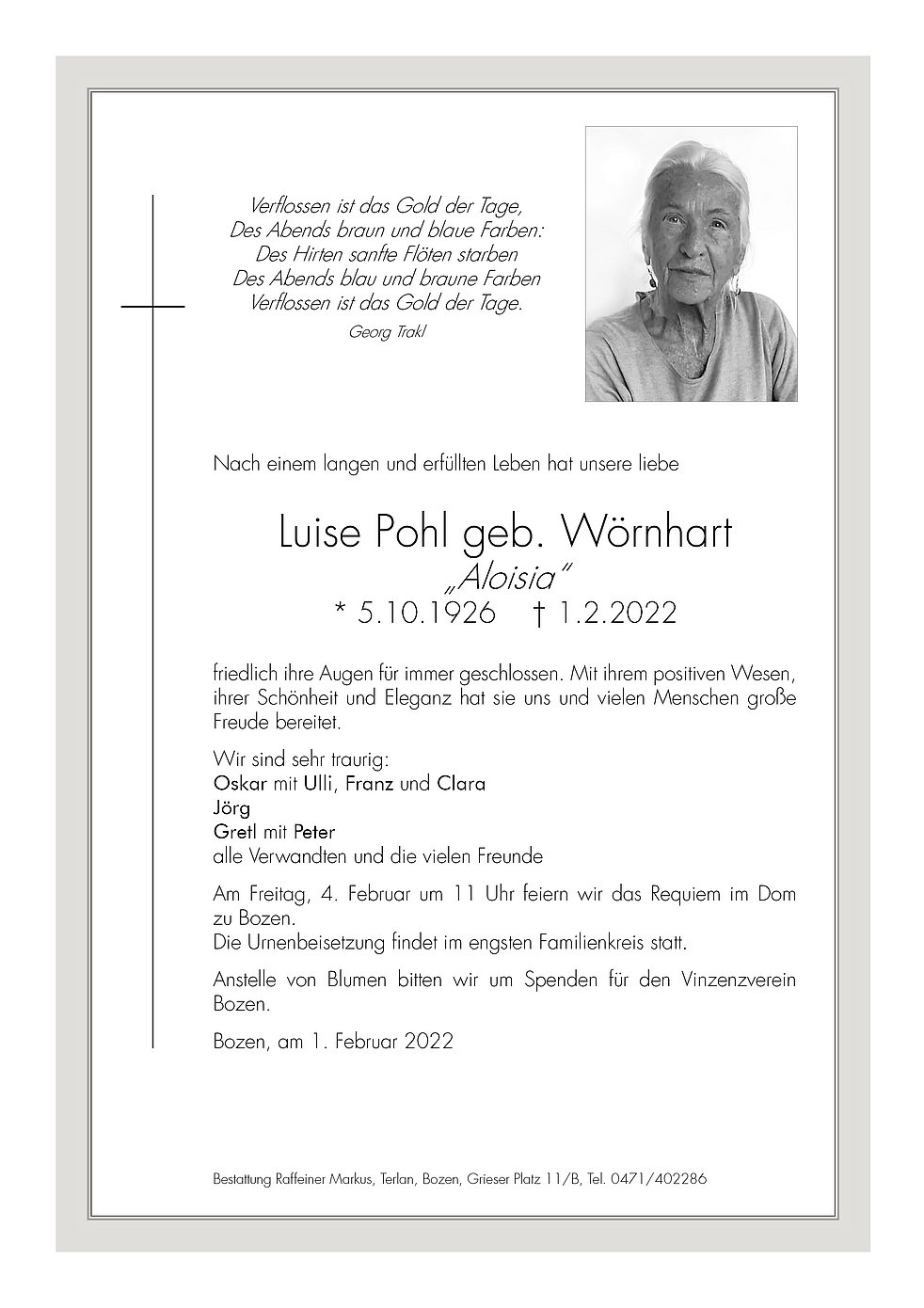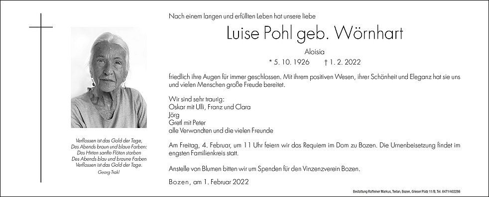Anstelle von Blumen bitten wir um Spenden für den Vinzenzverein Bozen.