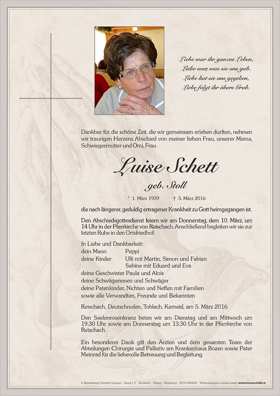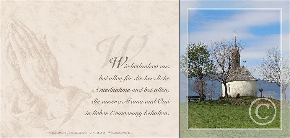 Ein besonderer Dank gilt den Ärzten und dem gesamten Team der Abteilungen Chirurgie und Palliativ am Krankenhaus Bozen sowie Pater Meinrad für die liebevolle Betreuung und Begleitung.