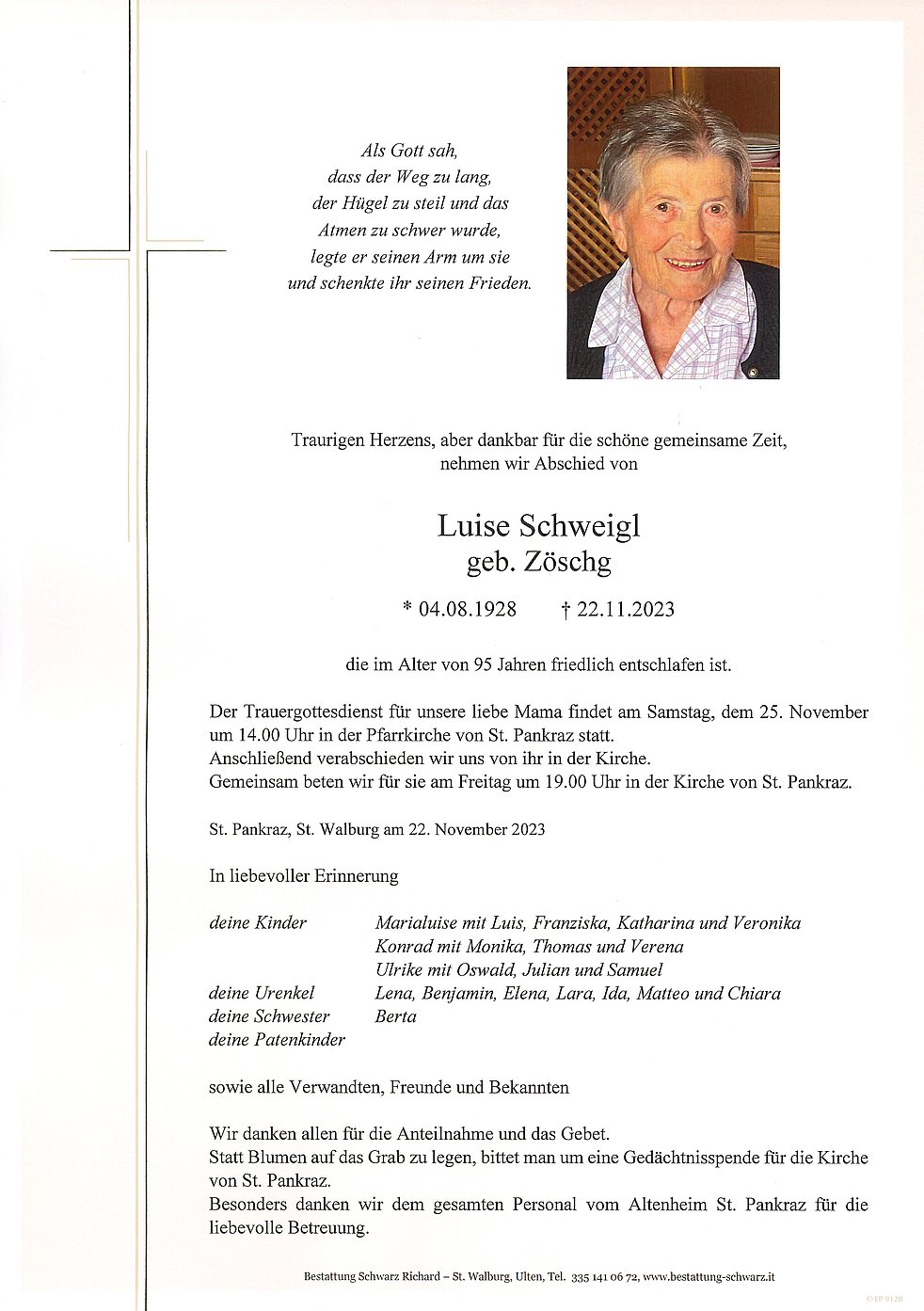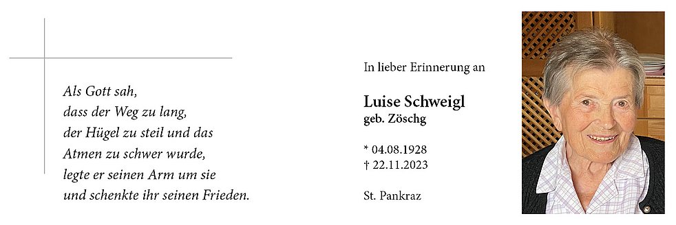 Der Trauergottesdienst für unsere liebe Mama findet am Samstag, dem 25. November um 14.00 Uhr in der Pfarrkirche von St. Pankraz statt.
