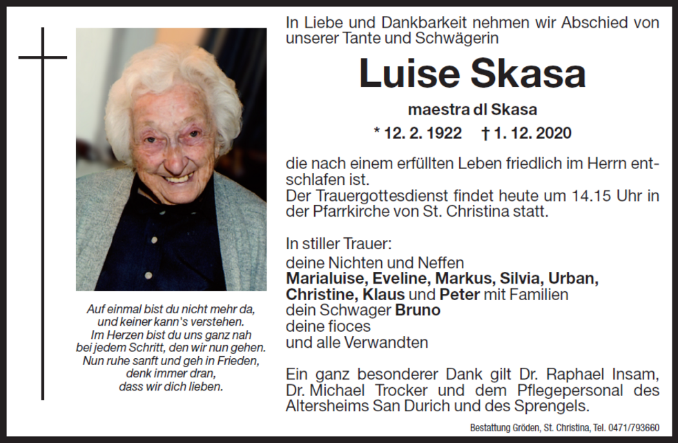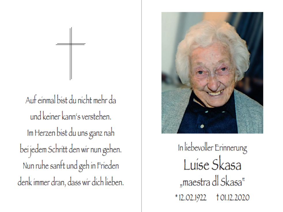 Ein ganz besonderer Dank gilt Dr. Raphael Insam, Dr. Michael Trocker und dem Pflegepersonal des Altersheim San Durich und des Sprengels.