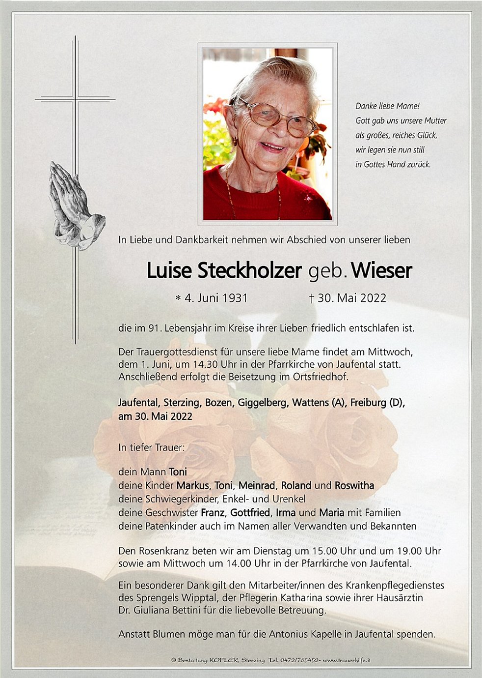 Der Trauergottesdienst für unsere liebe Mame findet am Mittwoch, dem 1. Juni, um 14.30 Uhr in der Pfarrkirche von Jaufental statt. Anschließend erfolgt die Beisetzung im Ortsfriedhof.