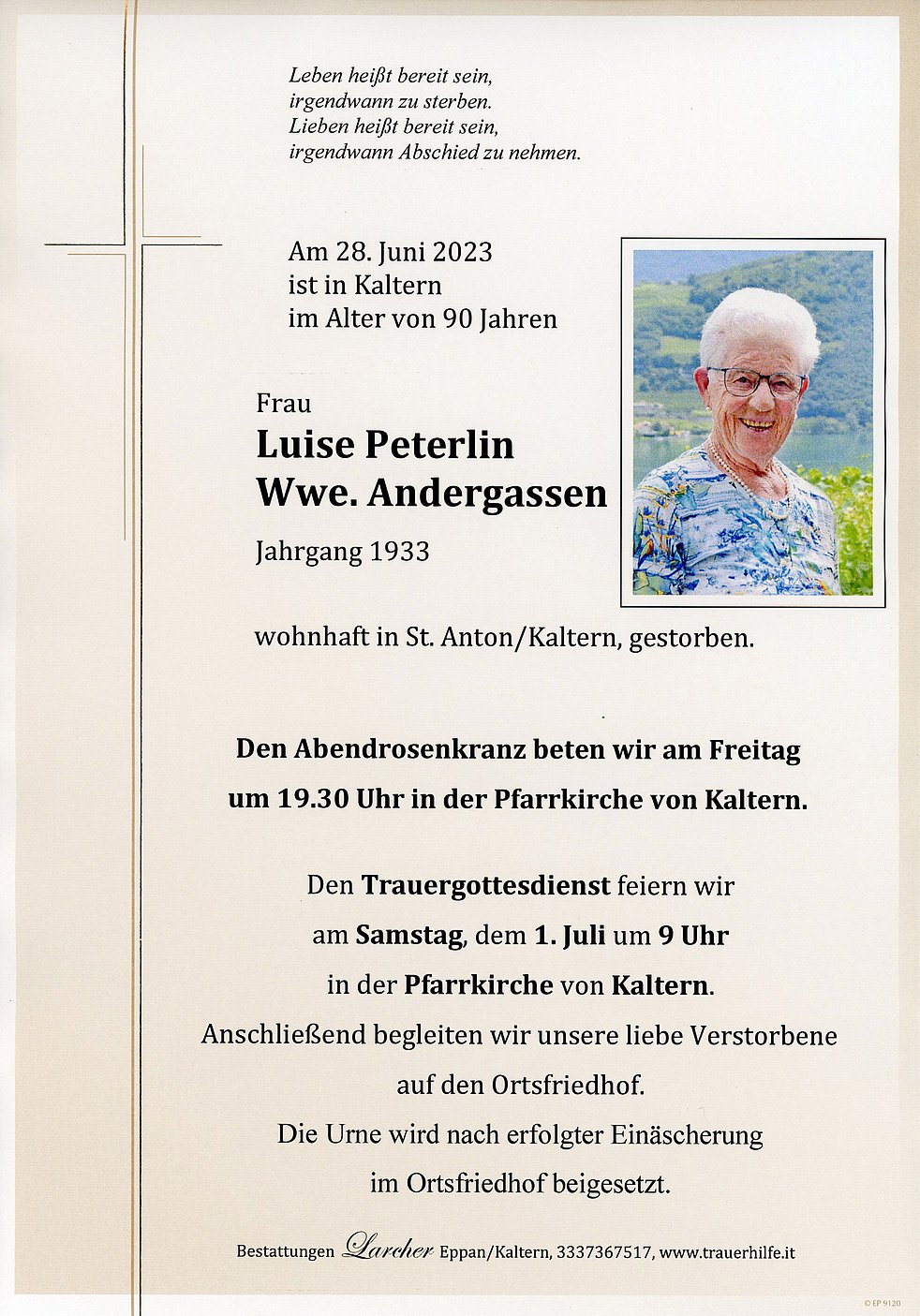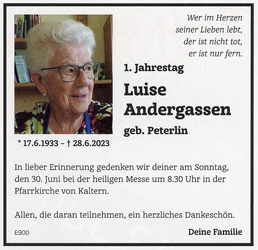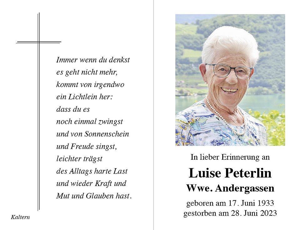 Den Abschiedsgottesdienst feiern wir am Samstag, dem 1. Juli um 9 Uhr in der Pfarrkirche von Kaltern. Anschließend begleiten wir unsere liebe Verstorbene auf den Ortsfriedhof.