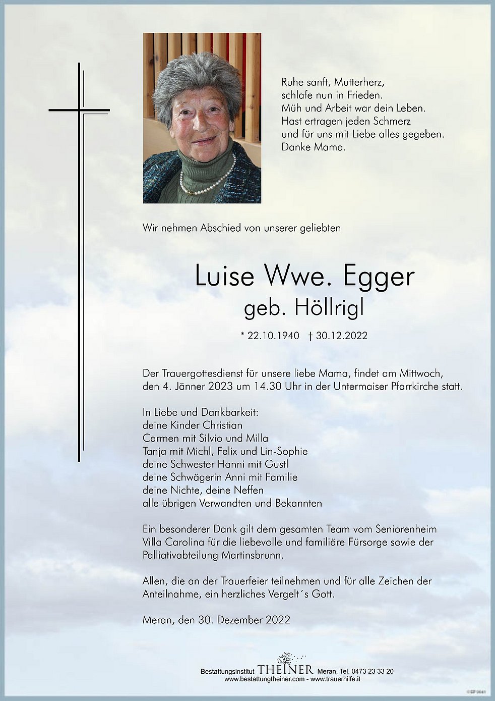 Der Trauergottesdienst für unsere liebe Mama, findet am Mittwoch, den 4. Jänner 2023 um 14.30 Uhr in der Untermaiser Pfarrkirche statt.