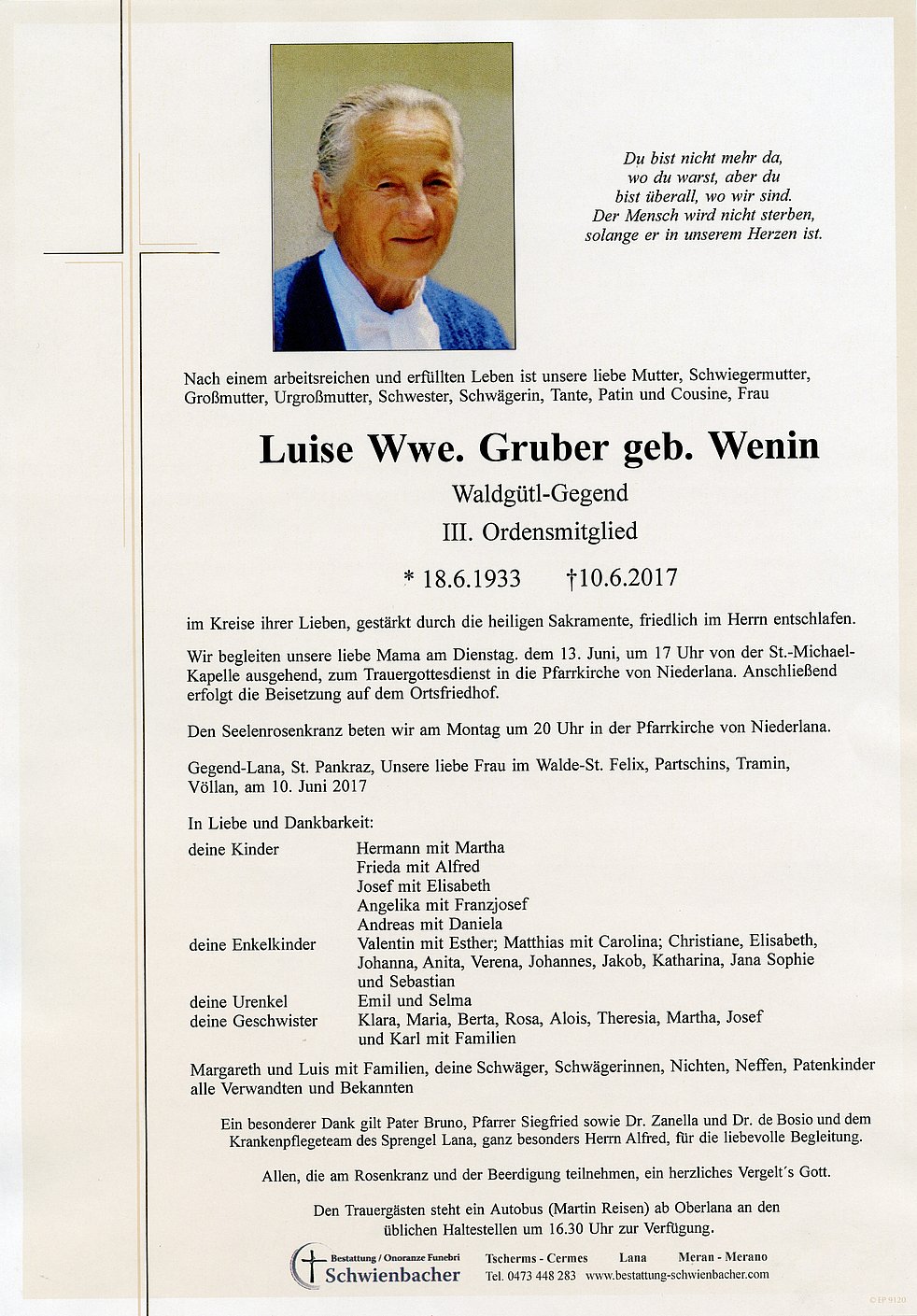 Wir begleiten unsere liebe Mama am Dienstag. dem 13. Juni, um 17 Uhr von der St.-Michael-Kapelle ausgehend, zum Trauergottesdienst in die Pfarrkirche von Niederlana. Anschließend