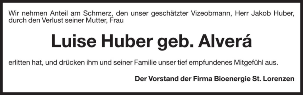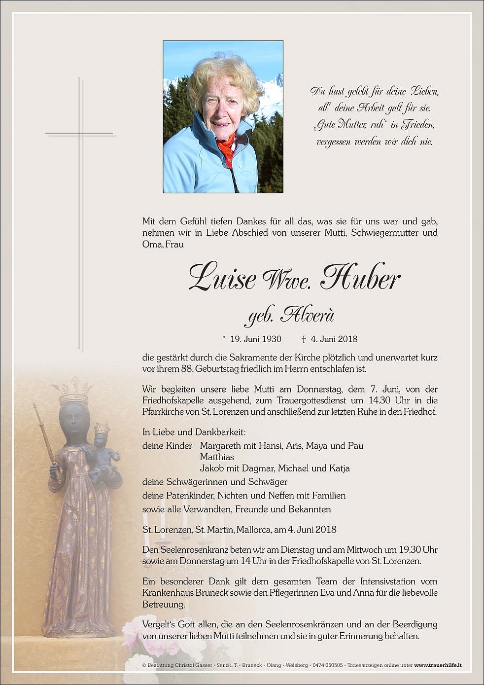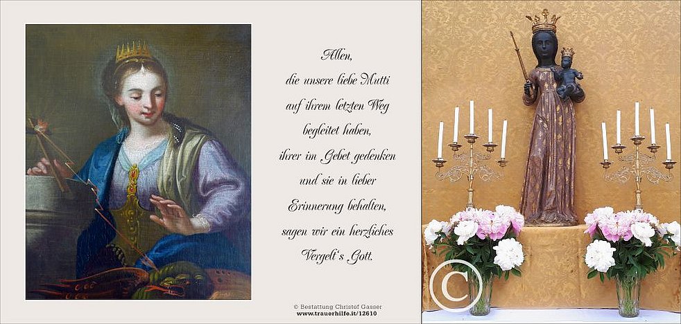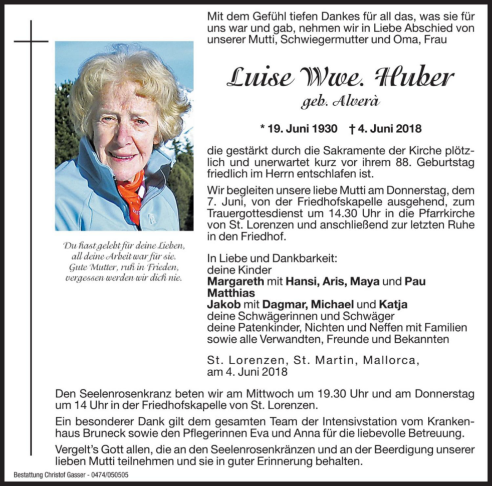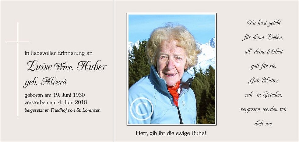 Wir begleiten unsere liebe Mutti am Donnerstag, dem 7. Juni, von der Friedhofskapelle ausgehend, zum Trauergottesdienst um 14.30 Uhr in die Pfarrkirche von St. Lorenzen und anschließend zur letzten Ruhe in den Friedhof.