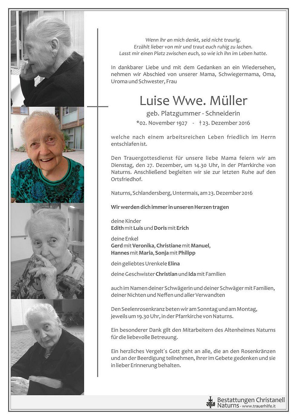 Den Trauergottesdienst für unsere liebe Mama feiern wir am Dienstag, den 27. Dezember, um 14.30 Uhr, in der Pfarrkirche von Naturns. Anschließend begleiten wir sie zur letzten Ruhe auf den Ortsfriedhof.