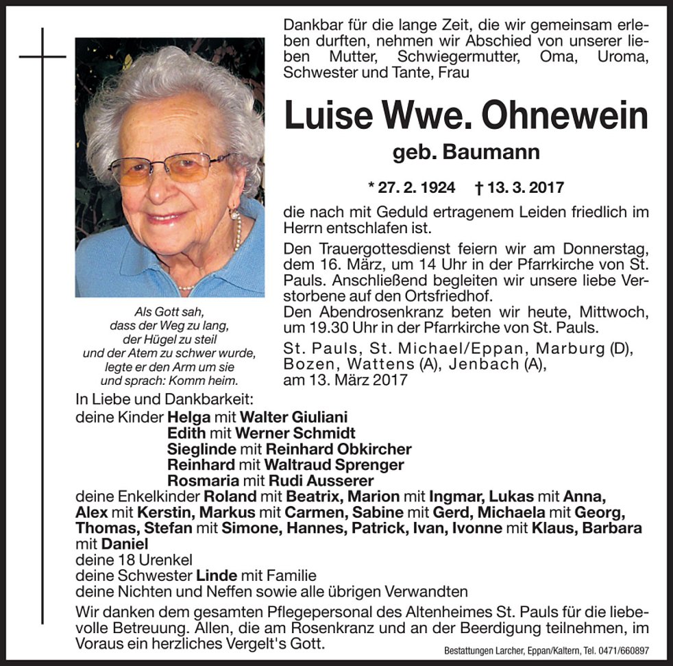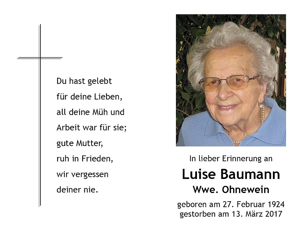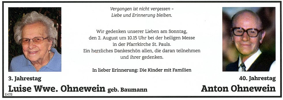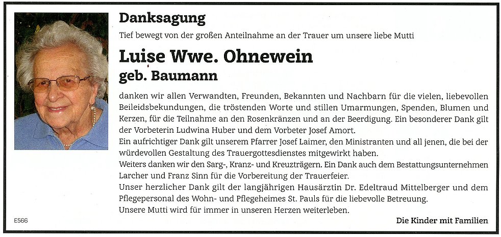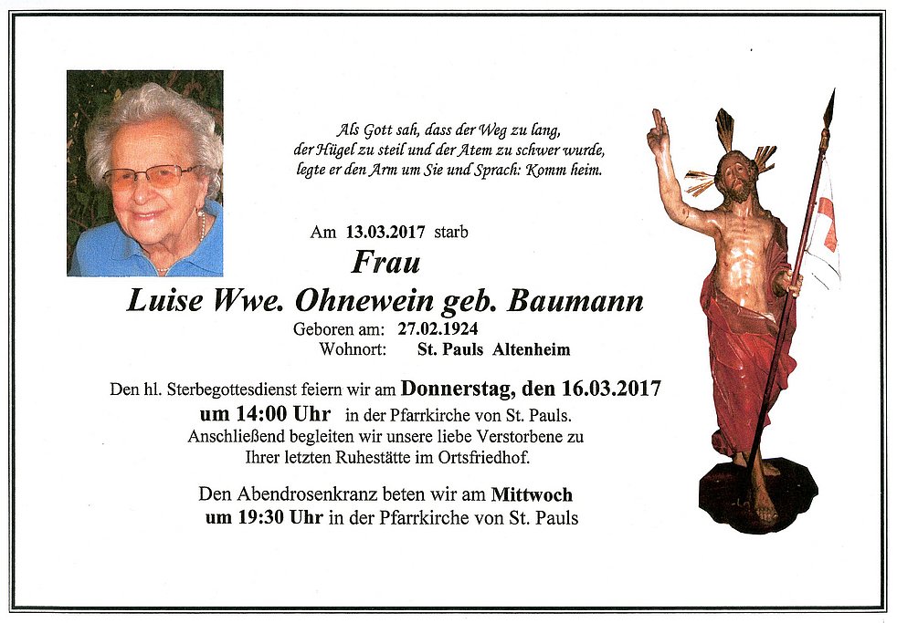 Den Trauergottesdienst feiern wir am Donnerstag, dem 16. März um 14 Uhr in der Pfarrkirche von St. Pauls. Anschließend begleiten wir unsere liebe Verstorbene auf den Ortsfriedhof.