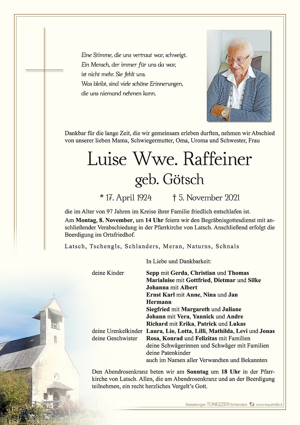 Am Montag, 8. November, um 14 Uhr feiern wir den Begräbnisgottesdienst mit anschließender Verabschiedung in der Pfarrkirche von Latsch.