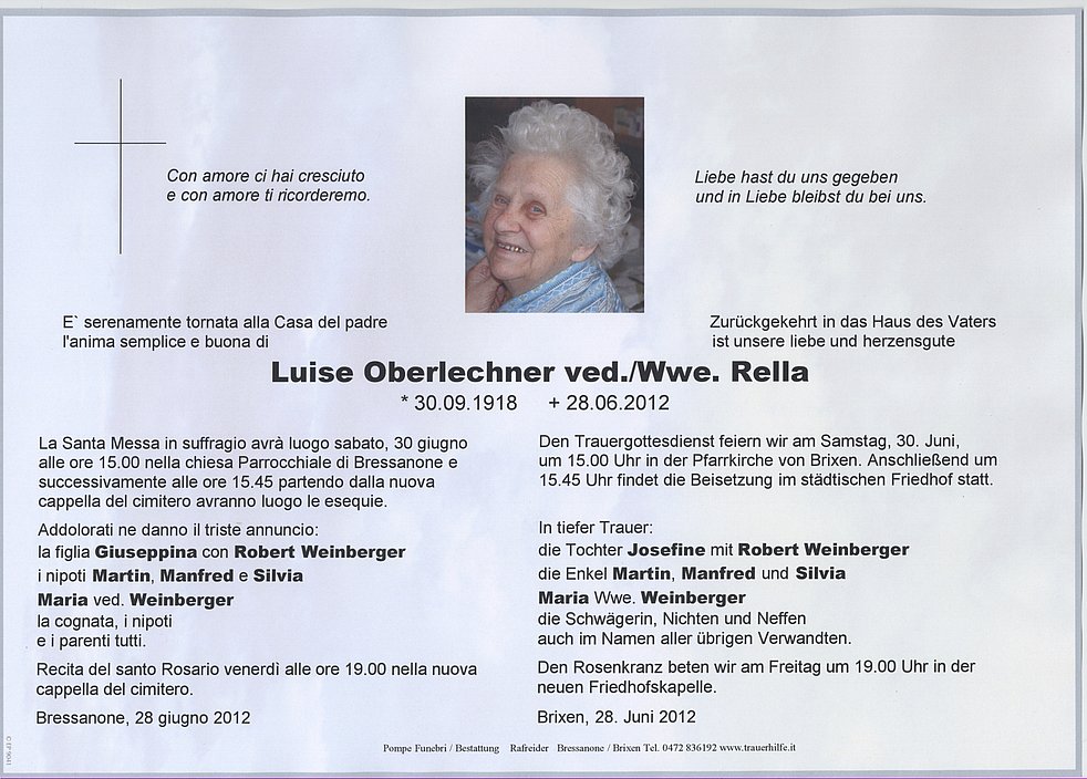 Den Trauergottesdienst feiern wir am Samstag, 30. Juni, um 15 Uhr in der Pfarrkirche von Brixen.