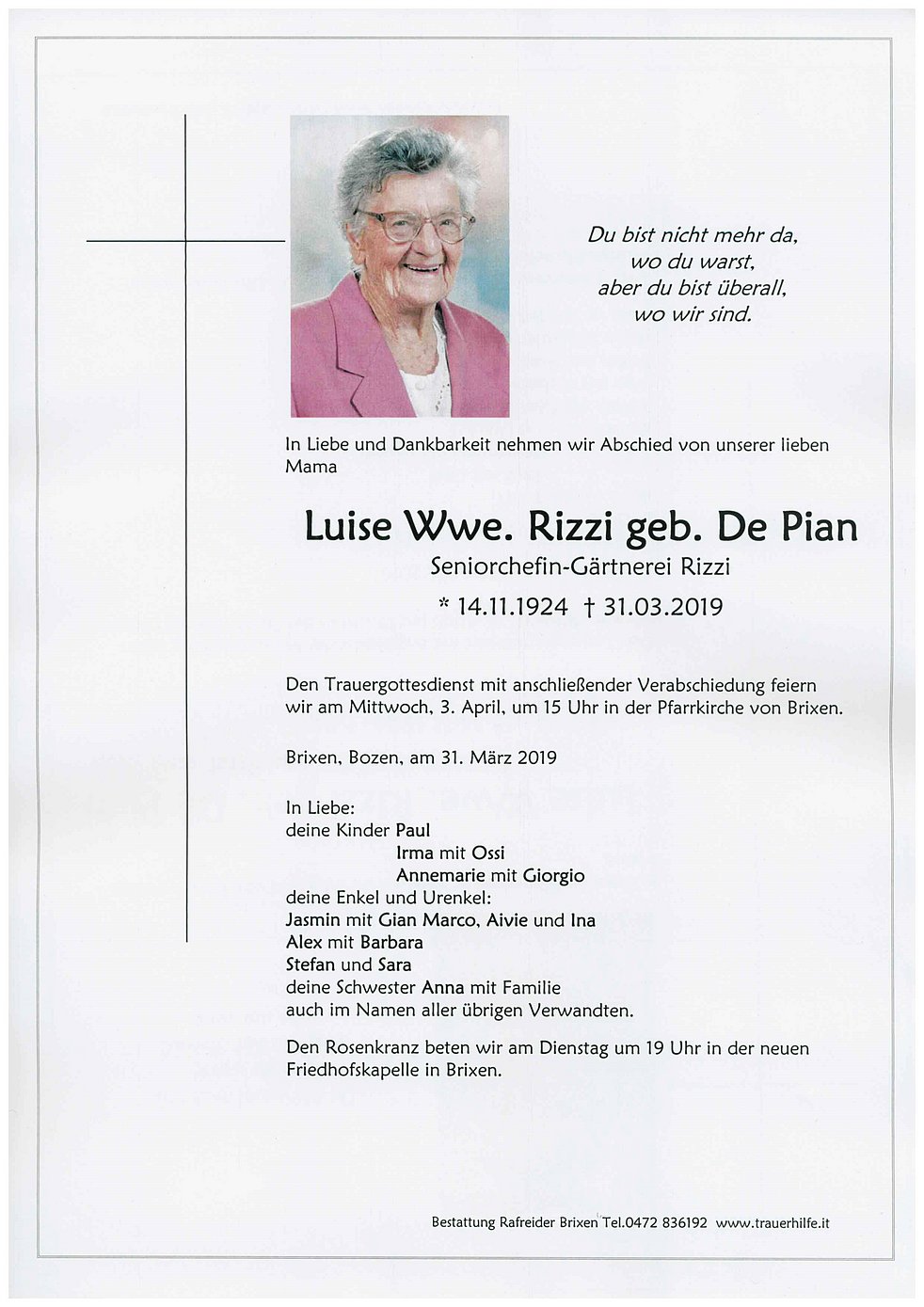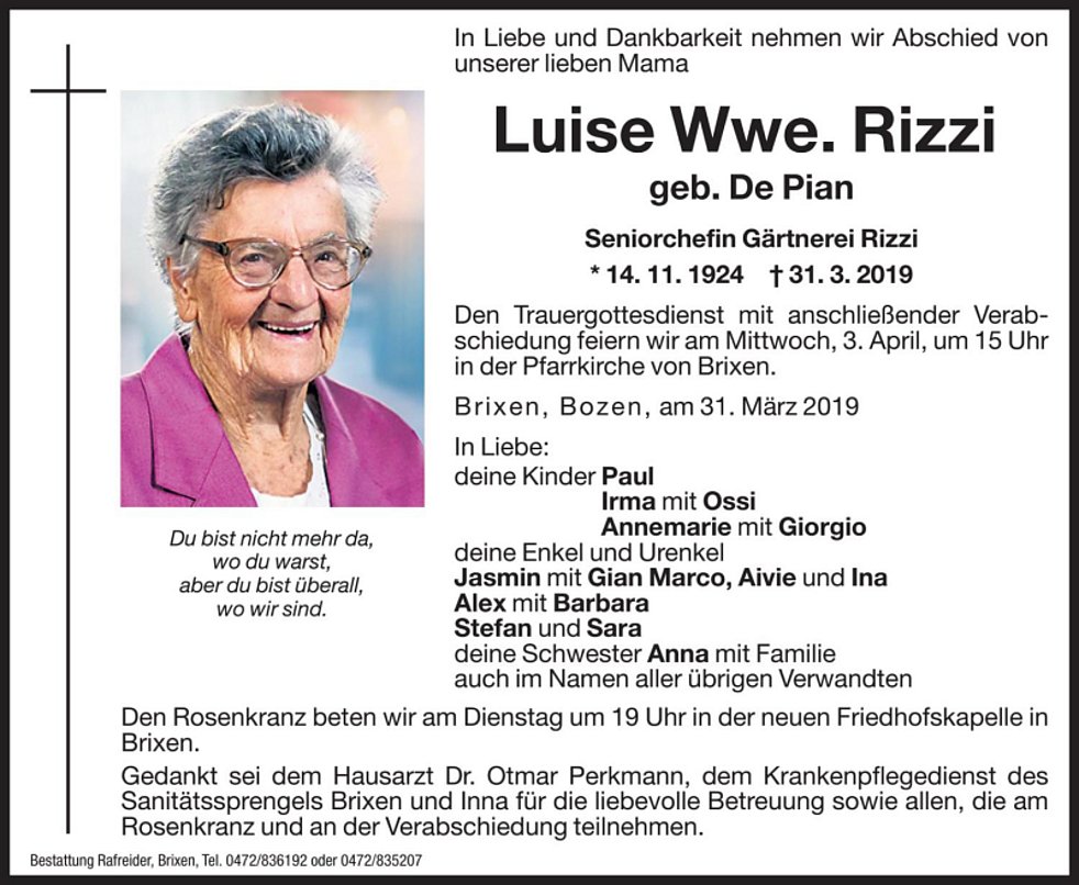 Gedankt sei dem Hausarzt Dr. Otmar Perkmann, dem Krankenpflegedienst des Sanitätssprengel Brixen und Inna für die liebevolle Betreuung sowie allen, die am Rosenkranz und an der Verabschiedung teilnehmen.