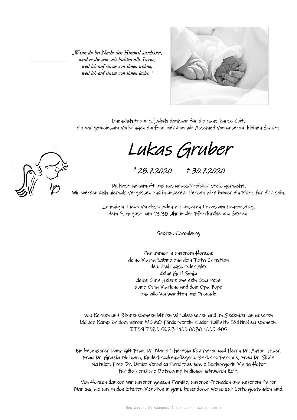Von Kerzen und Blumenspenden bitten wir abzusehen und im Gedenken an unseren kleinen Kämpfer dem Verein MOMO Förderverein Kinder Palliativ Südtirol zu spenden. IT09 T080 5623 1100 0030 1005 405