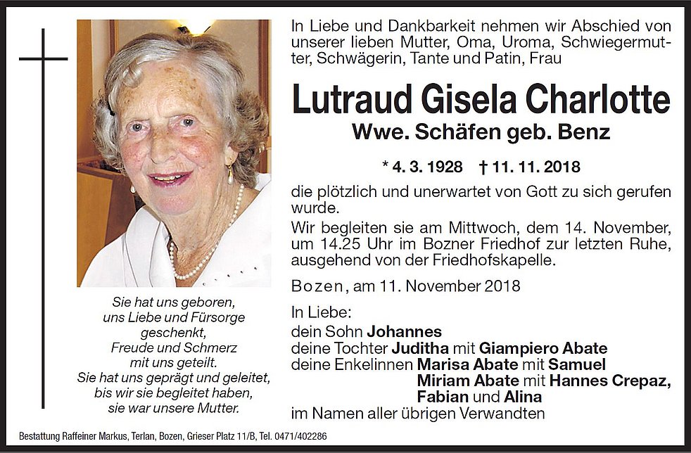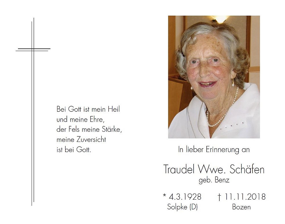 Wir begleiten sie am Mittwoch, dem 14. November, um 14.25 Uhr im Bozner Friedhof zur letzten Ruhe ausgehend von der Friedhofskapelle.