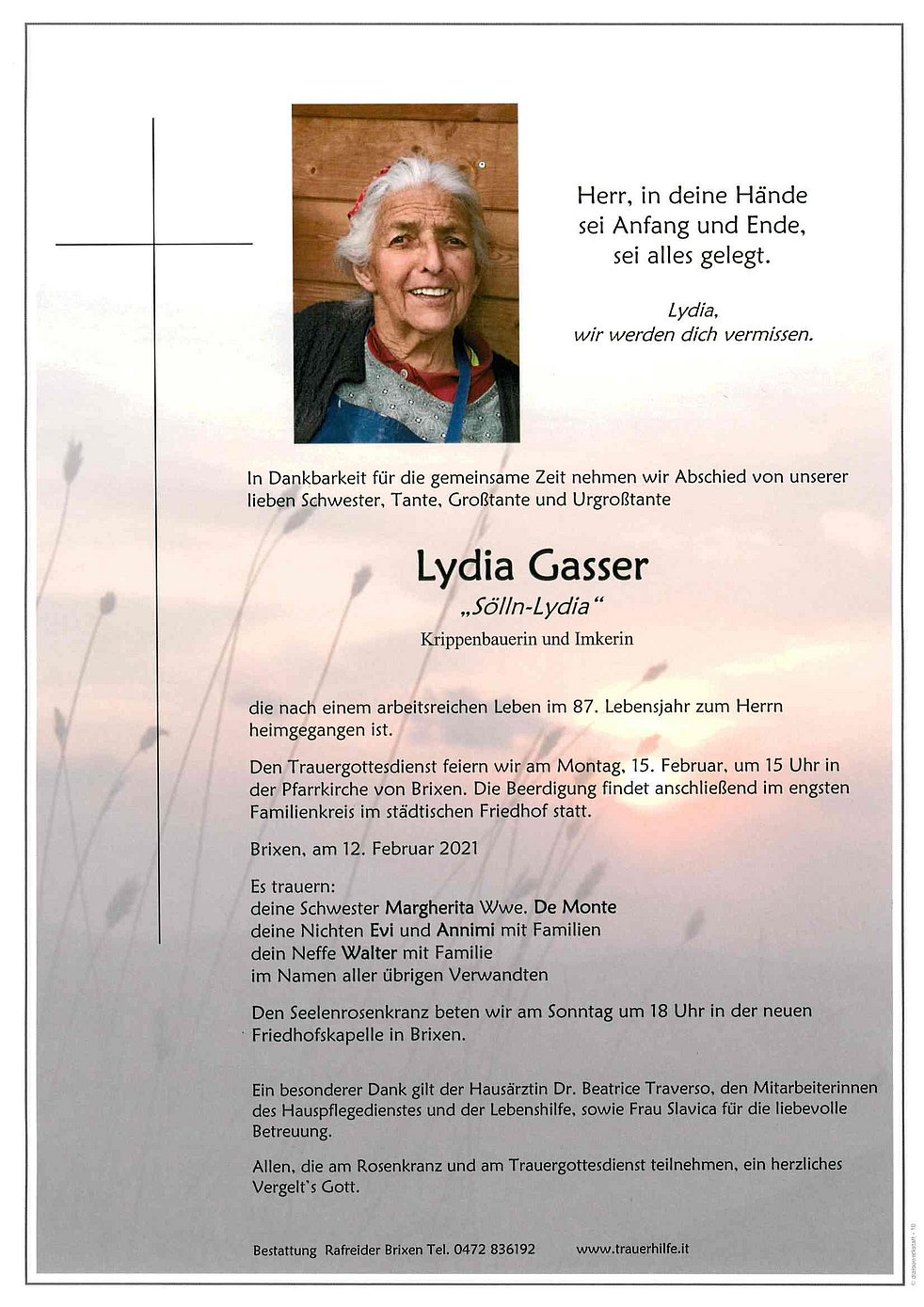 Den Trauergottesdienst feiern wir am Montag, 15. Februar, um 15 Uhr in der Pfarrkirche von Brixen. Die Beerdigung findet anschließend im engsten Familienkreis im städtischen Friedhof statt.