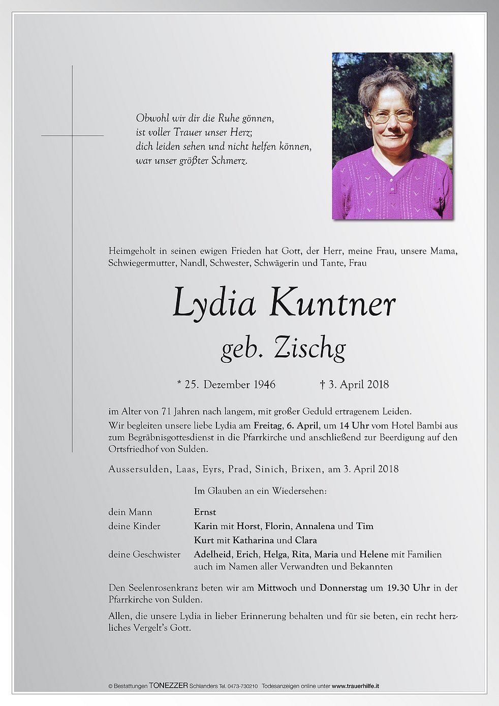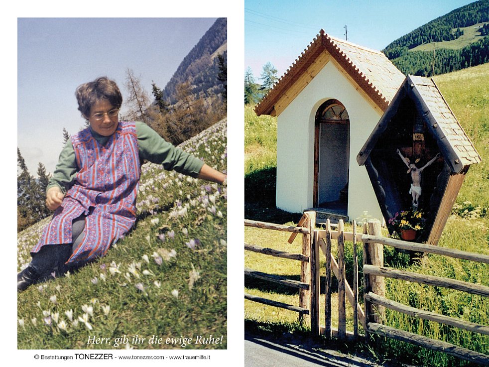Wir begleiten unsere liebe Verstorbene am Freitag, 6. April, um 14 Uhr vom Hotel Bambi aus zum Begräbnisgottesdienst in die Pfarrkirche und anschließend zur Beerdigung auf den Ortsfriedhof von Sulden.