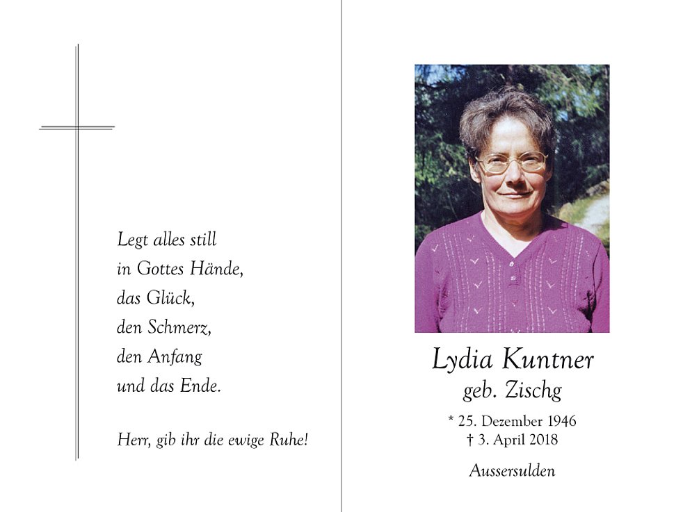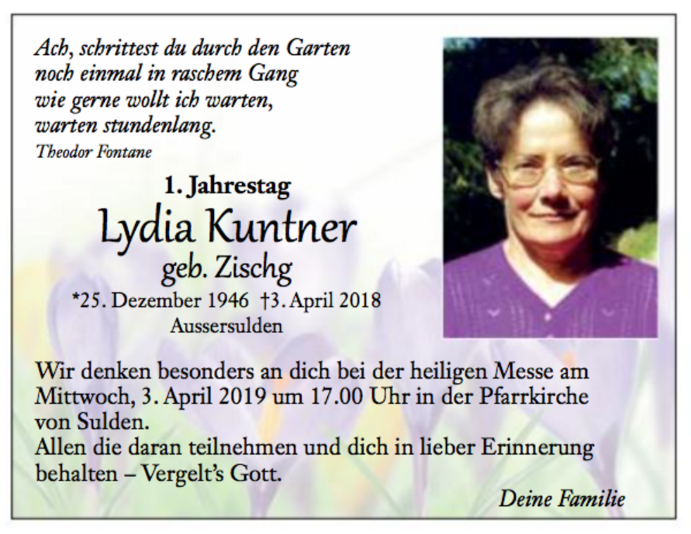 Allen, die unsere Lydia in lieber Erinnerung behalten und für sie beten, ein recht herzliches Vergelt’s Gott.
