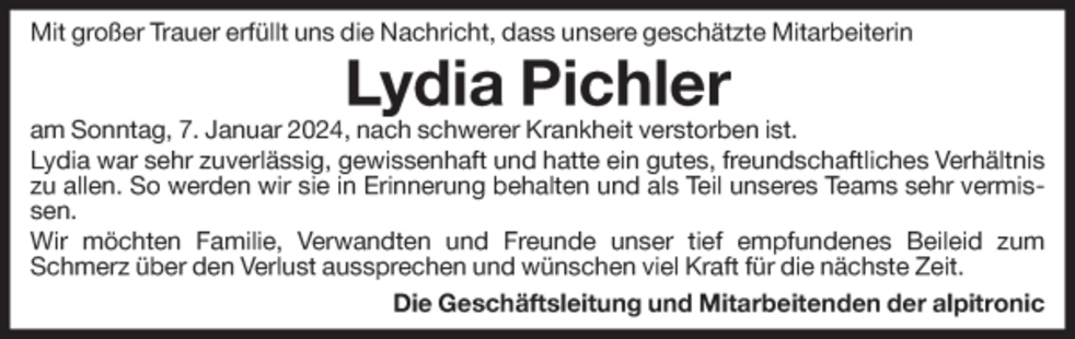 Wir verabschieden uns von unserer Lydia beim Trauergottesdienst am Donnerstag, 11. Jänner, um 14.30 Uhr in der Pfarrkirche von Deutschnofen.