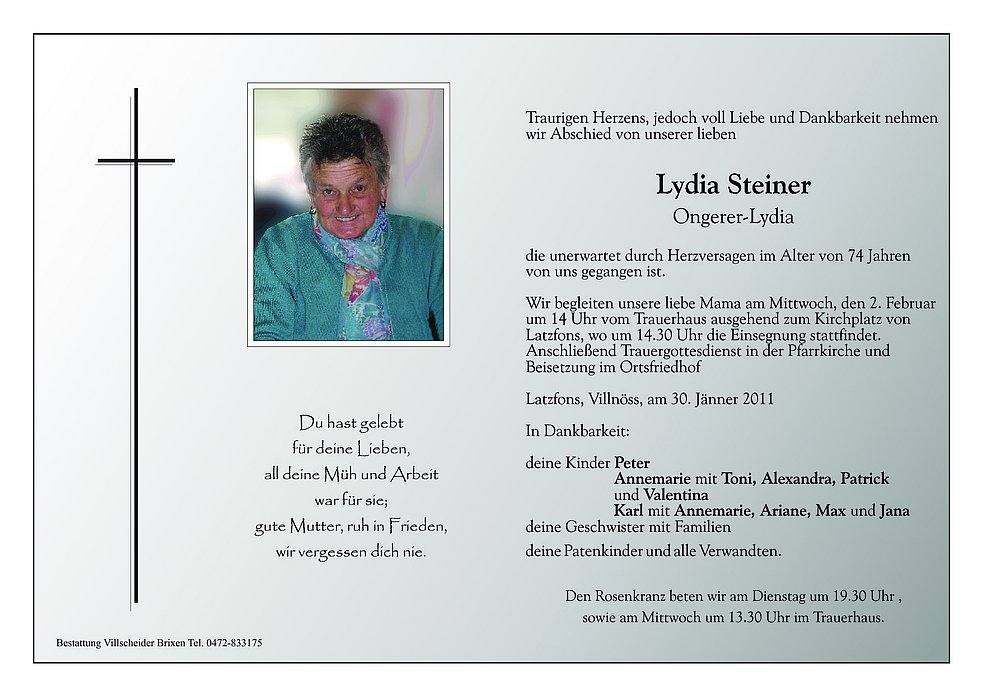 Wir begleiten unsere liebe Mama am Mittwoch, den 2. Februar um 14 Uhr vom Trauerhaus ausgehend zum Kirchplatz von Latzfons, wo um 14.30 Uhr die Einsegnung stattfindet.