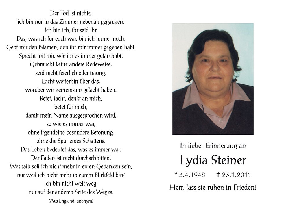 Am Mittwoch, 26. Jänner, um 14 Uhr feiern wir den Begräbnisgottesdienst in der Pfarrkirche und anschließend begleiten wir unsere liebe Lydia zur Verabschiedung auf den Ortsfriedhof von Schlanders.