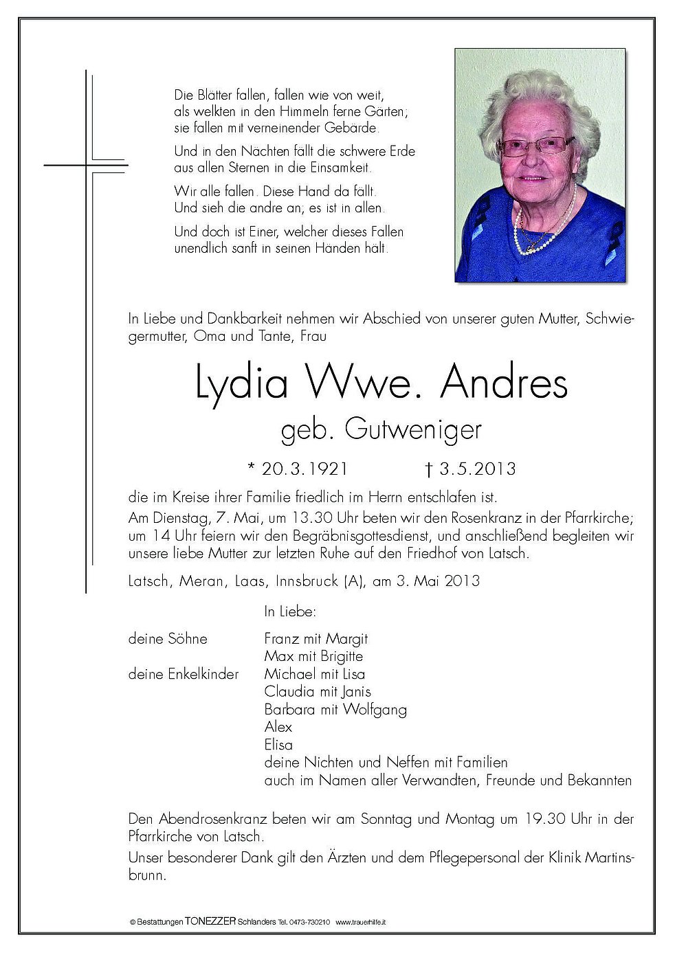 Am Dienstag, 7. Mai, um 13.30 Uhr beten wir den Rosenkranz in der Pfarrkirche; um 14 Uhr feiern wir den Begräbnisgottesdienst, und anschließend begleiten wir unsere liebe Mutter zur letzten Ruhe auf den Friedhof von Latsch.
