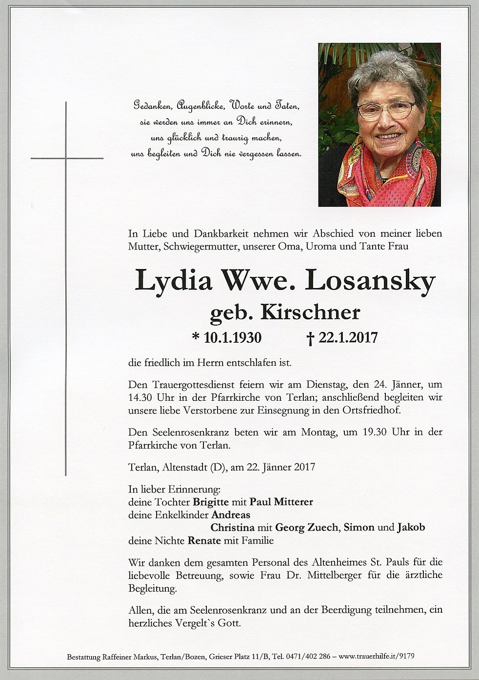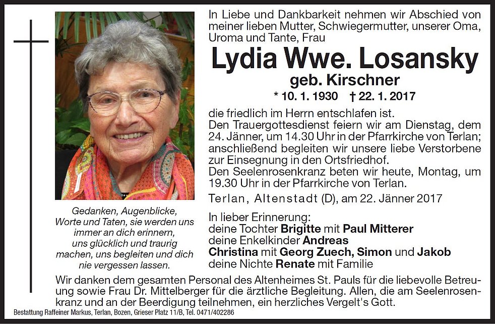 Den Trauergottesdienst feiern wir am Dienstag, dem 24. Jänner, um 14.30 Uhr in der Pfarrkirche von Terlan; anschließend begleiten wir unsere liebe Verstorbene zur Einsegnung in den Ortsfriedhof.