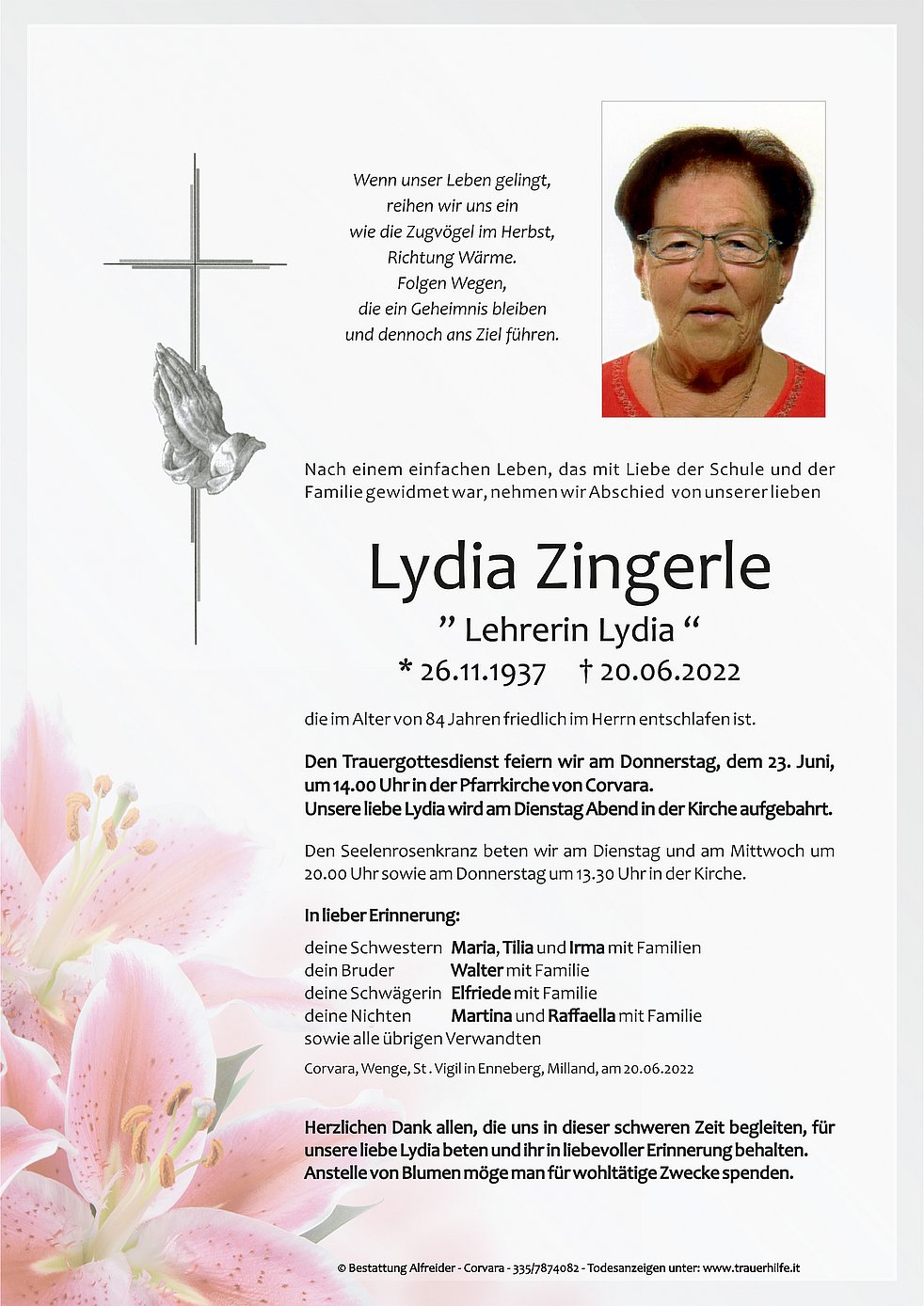 Den Trauergottesdienst feiern wir am Donnerstag, dem 23. Juni, um 14.00 Uhr in der Pfarrkirche von Corvara.